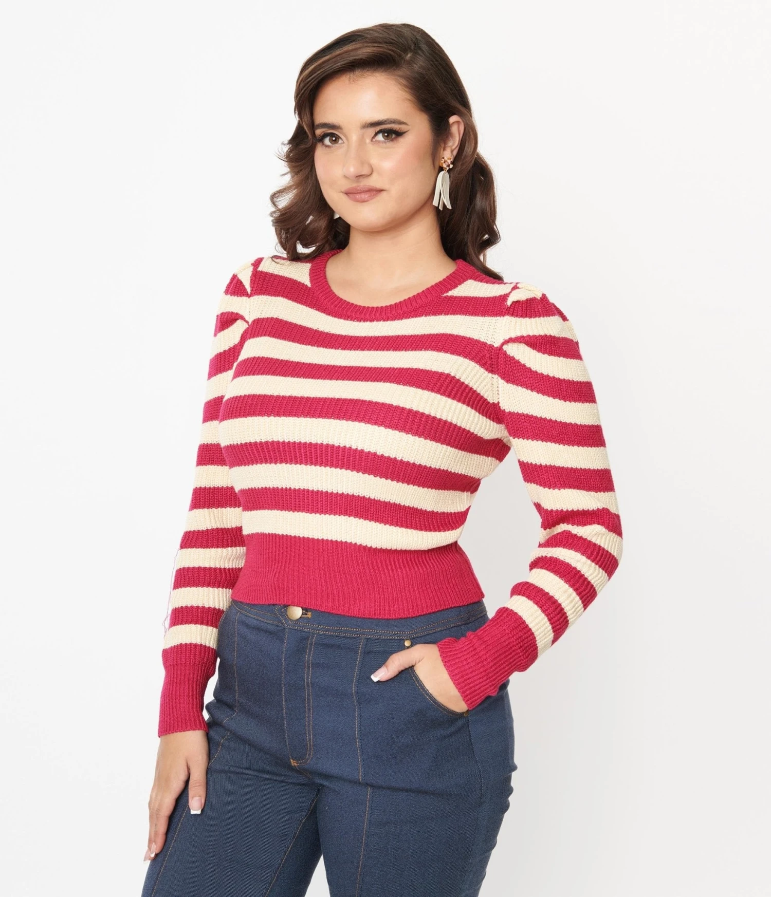 This sweet sweater is crafted in a soft knit fabric and set in berry pink and cream stripes. Complete with scoop neck and long sleeves