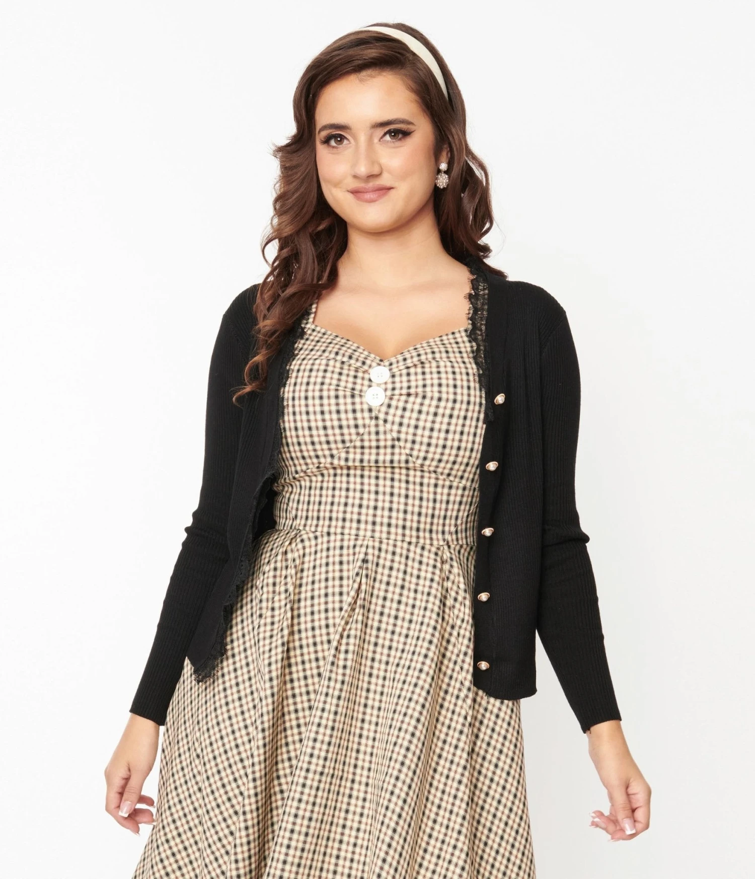 This sweet cardigan is crafted in a black ribbed knit fabric and features a button front, accented with a lace collar and cuffs.