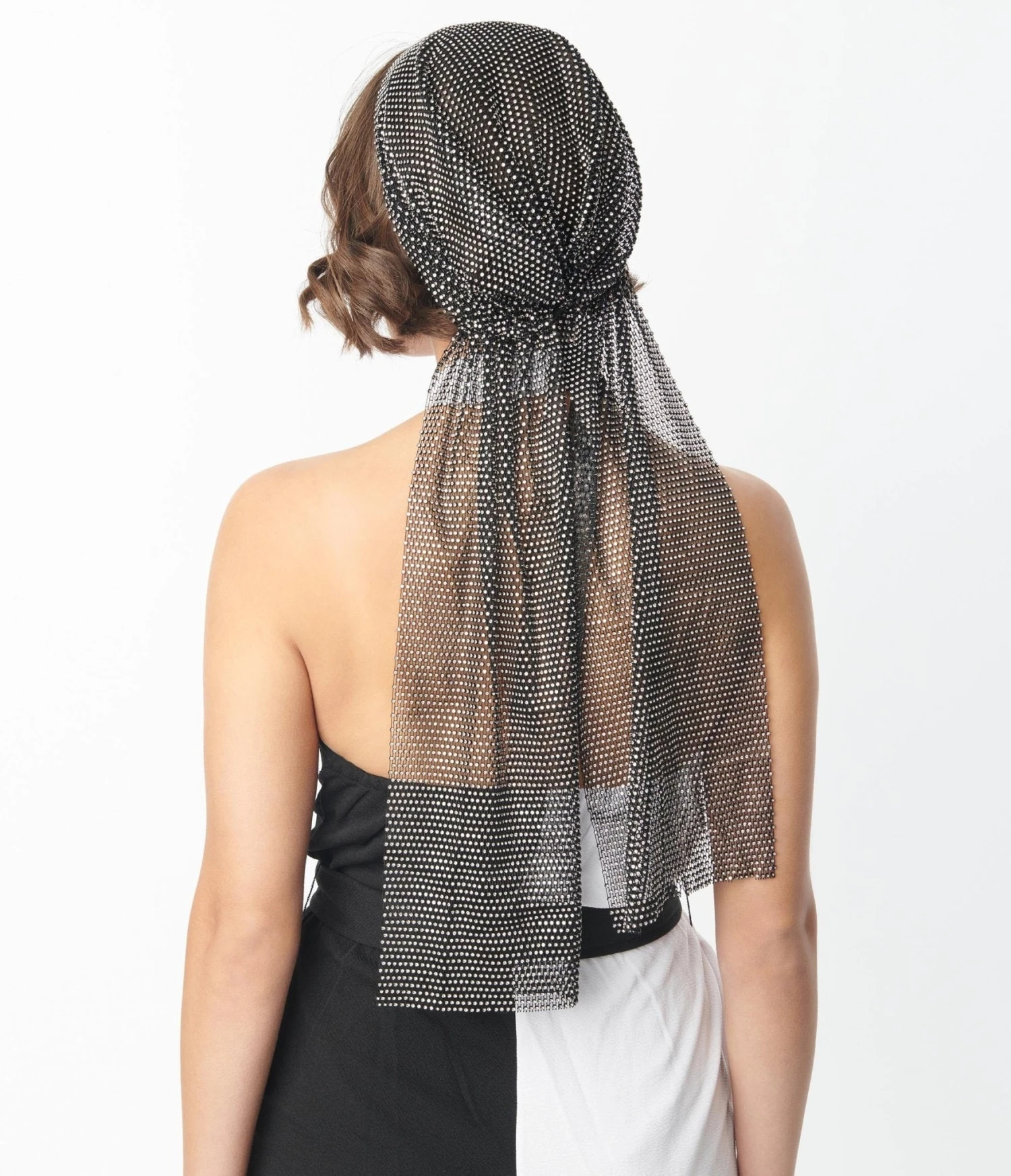 This retro headscarf is crafted in black mesh with elastic threading that sparkles with silver rhinestones throughout. Designed with a cap and two long ties.