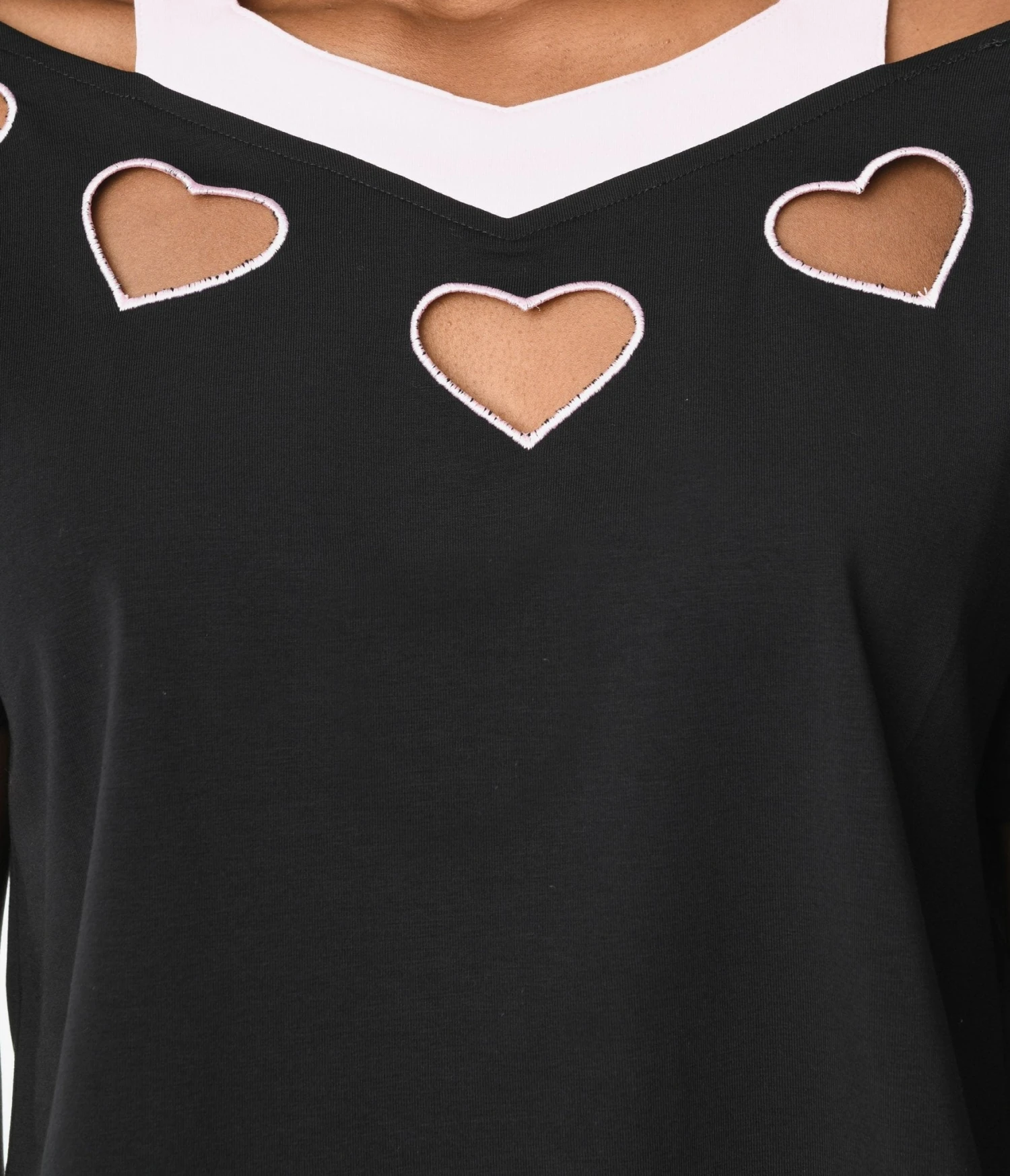 Fall in love with this enchanting piece that blends chic sophistication with a dash of playful charm. With its stunning black fabric adorned with delightful pink heart cutouts across the shoulders, you’ll radiate irresistible style wherever you go. The trendy short cold shoulder sleeves add a modern twist, while the flirty V neckline adds just the right amount of allure to complete your look.