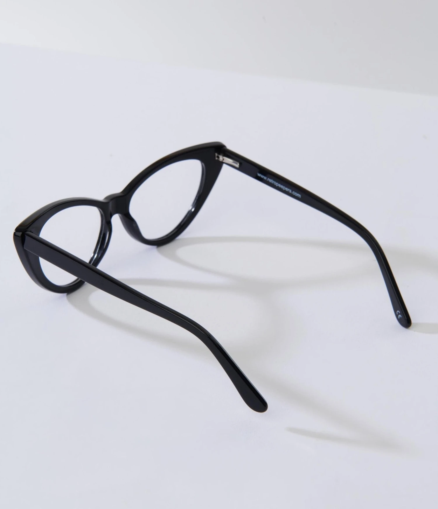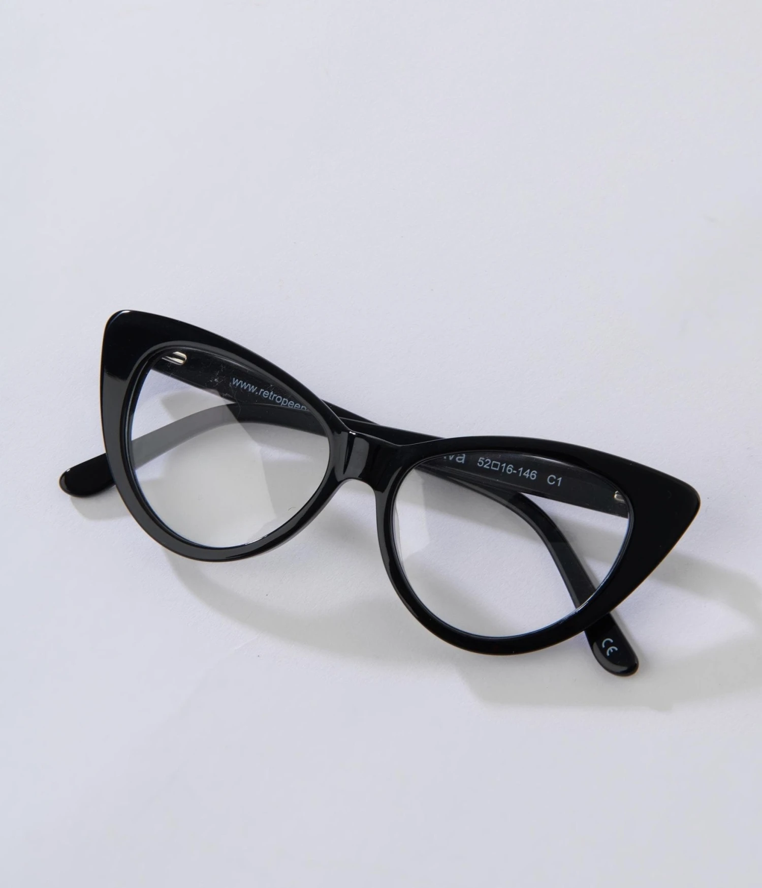 This stylish pair of retro sunglasses boast a classic cat eye style featuring a black frame with clear lenses. Complete with curved arms and molded nose.