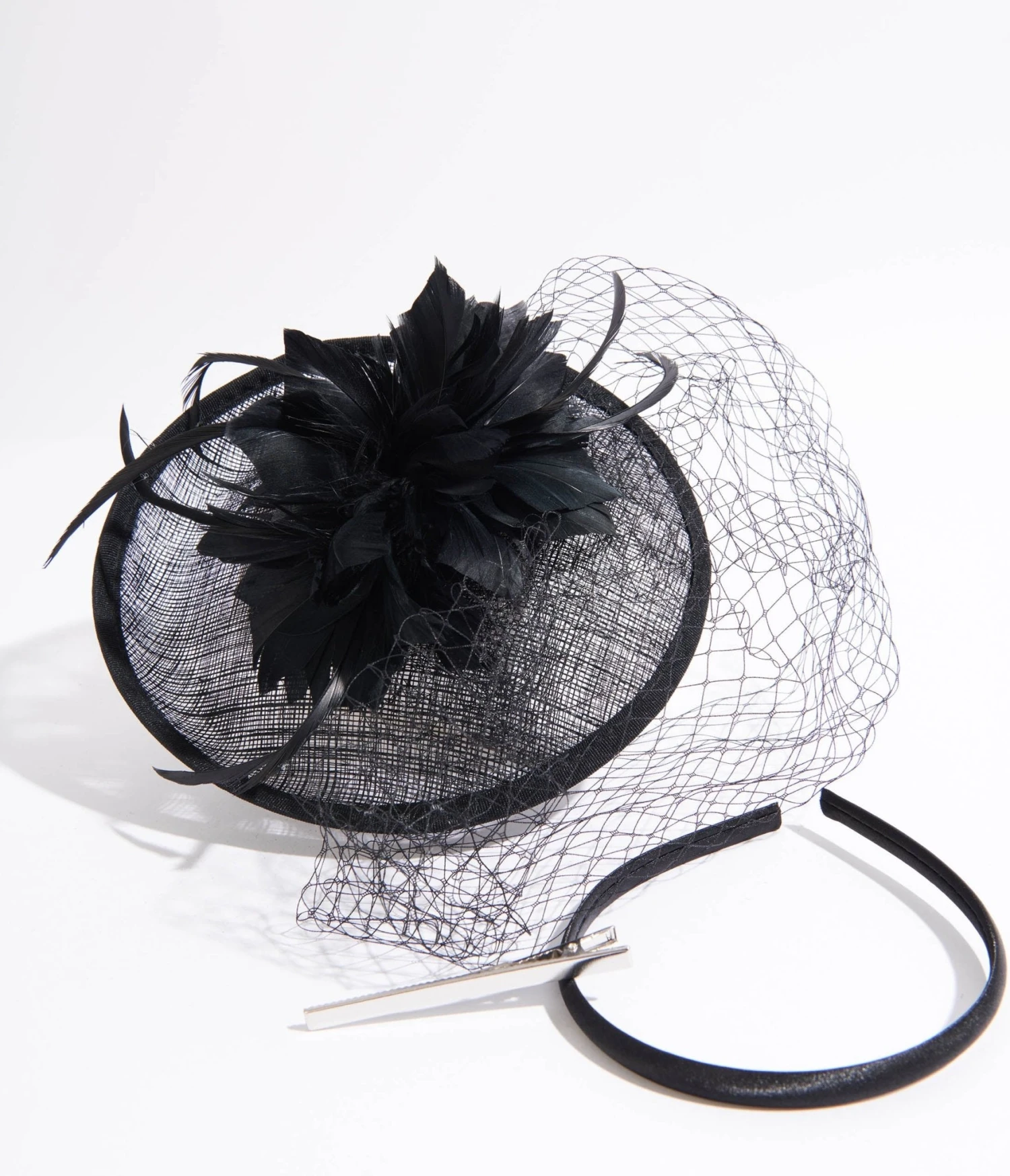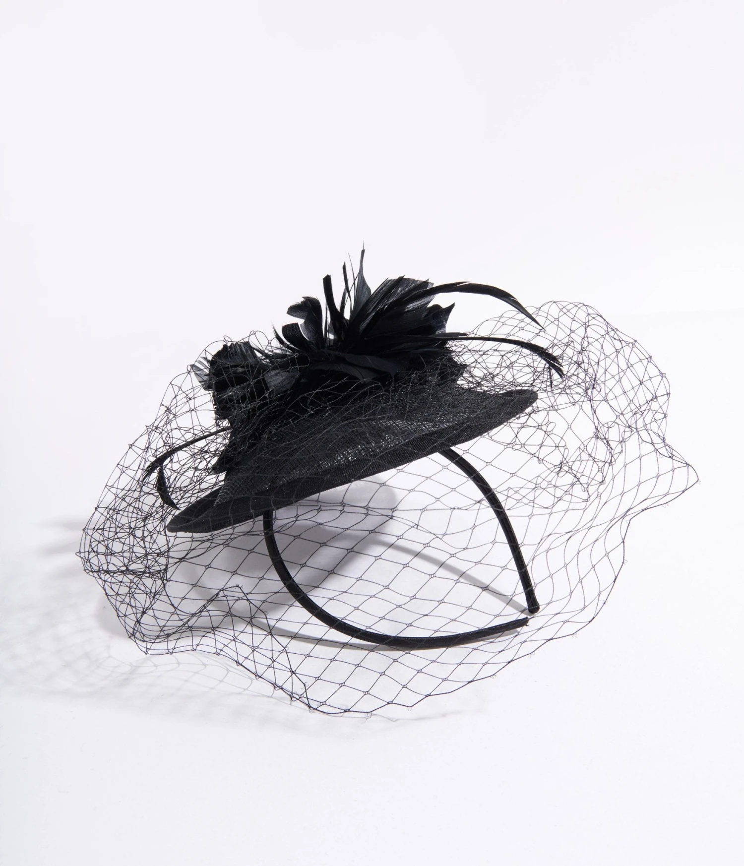 Give ’em a little ‘wow’! A magnificent black sinamay fascinator hat boasting gorgeous netted overlay, a lovely array of feathers and a large alligator clip to securely attach to your hair. Comes complete with a charming black satin headband for secure wear. Dumbstruck is good, dear.