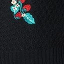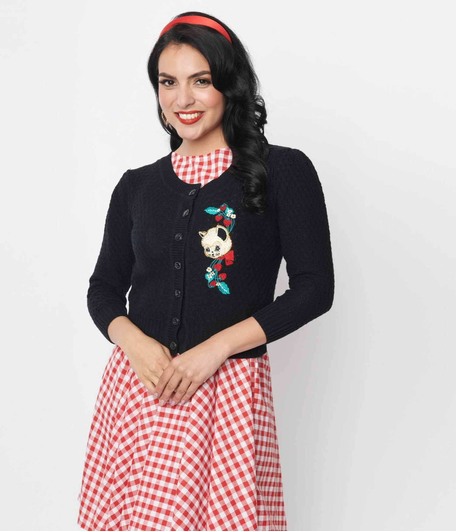 This darling cardigan is crafted in a black knit and boasts an adorable cat and strawberry embroidery. Outfitted with a button down opening and quarter sleeve.