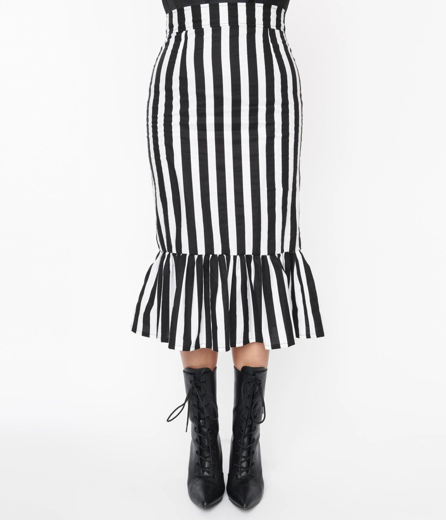 This gorgeous pencil skirt is crafted in sturdy woven fabric set in black and white stripes. Complete with ruffle peplum and back zipper.