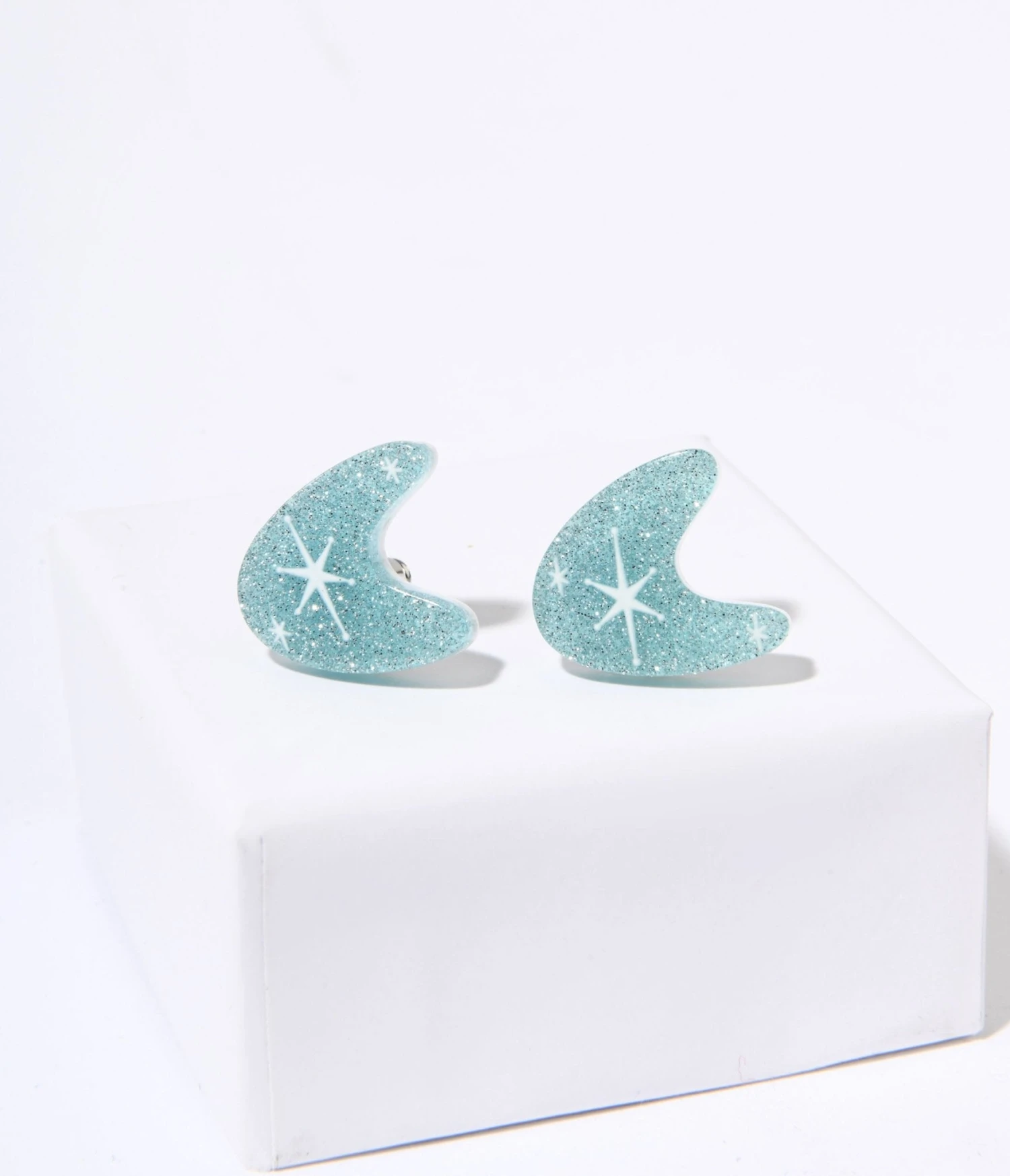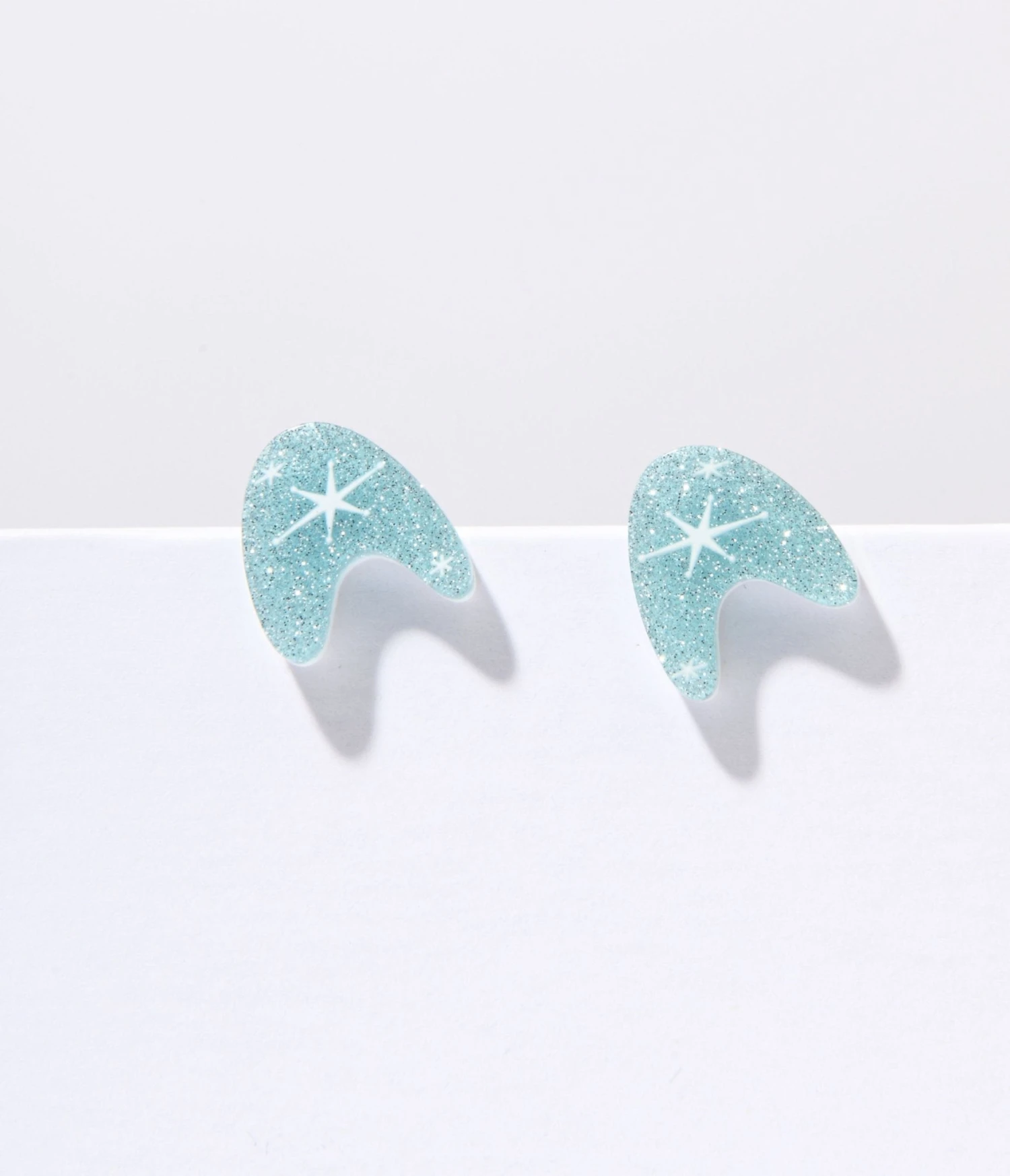 These stud earrings are uniquely shaped like an atomic boomerang, adding a touch of retro charm to your look. Crafted from lightweight and durable brilliant glitter blue resin, they are comfortable to wear all day without weighing you down. Complete with post-backs.