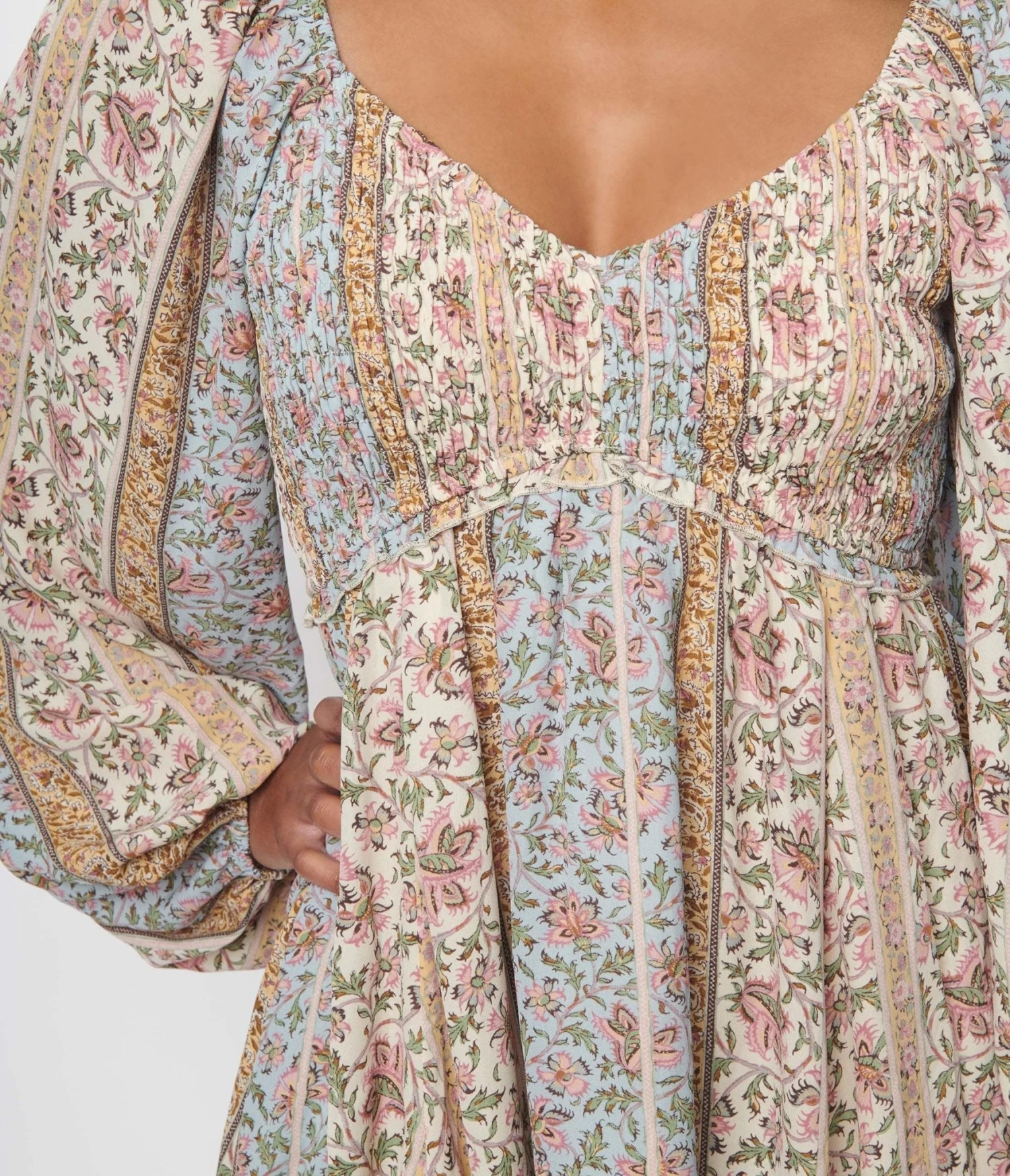 This gorgeous woven crepe babydoll dress is designed with a playful combination of blue and pink stripes, adorned with charming florals that will make you feel like a blooming beauty. With its flattering elastic V neckline and long elastic cuff sleeves, this dress effortlessly enhances your natural elegance. The waistband gently cinches in, gracefully highlighting your figure, while the smocked back adapts perfectly to your shape. Complete with convenient side pockets!