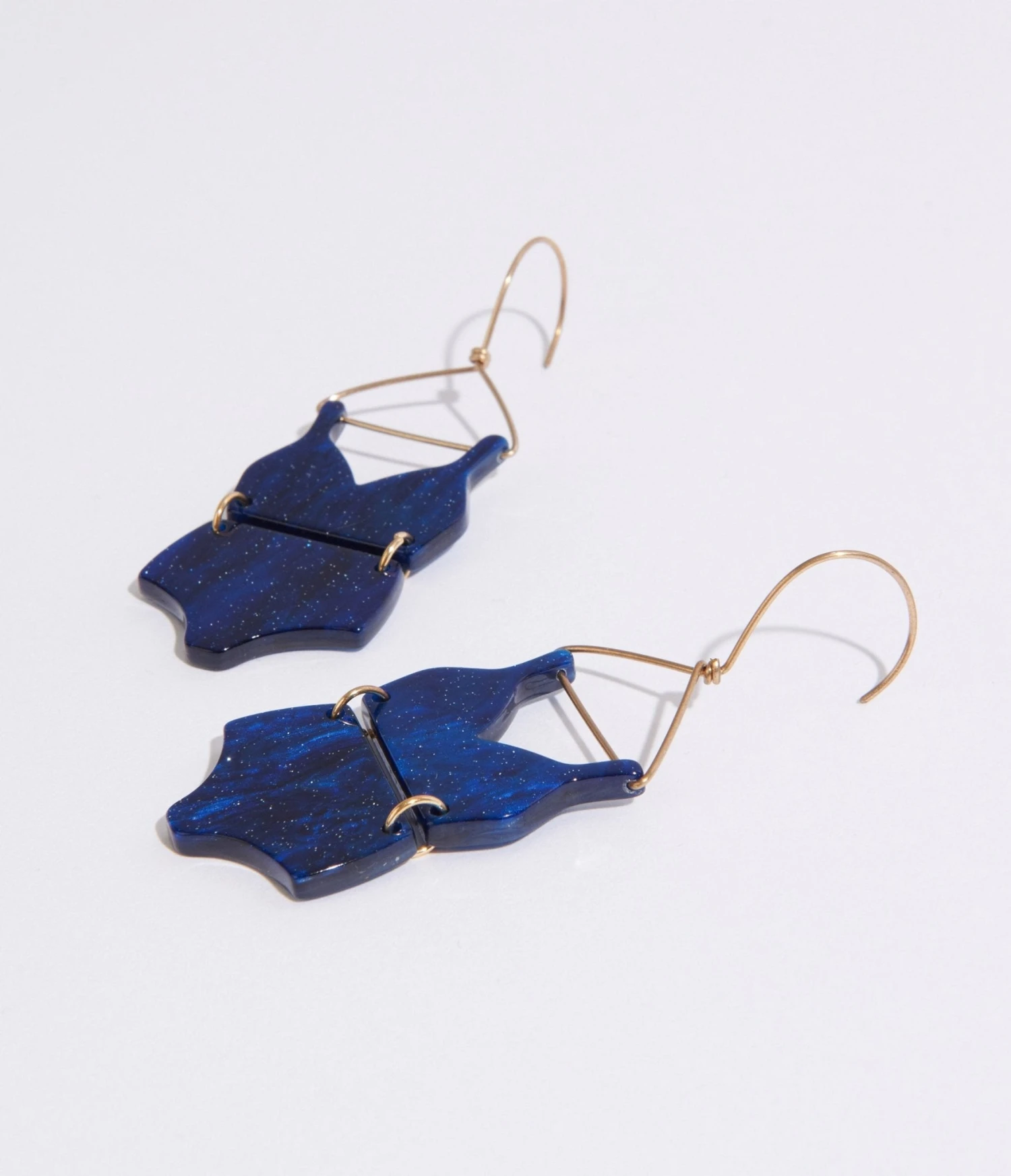 These sweet earrings are crafted in a glittery blue acrylic and set in the shape of a bikini, that hangs from gold hardware posts that look like hangers!
