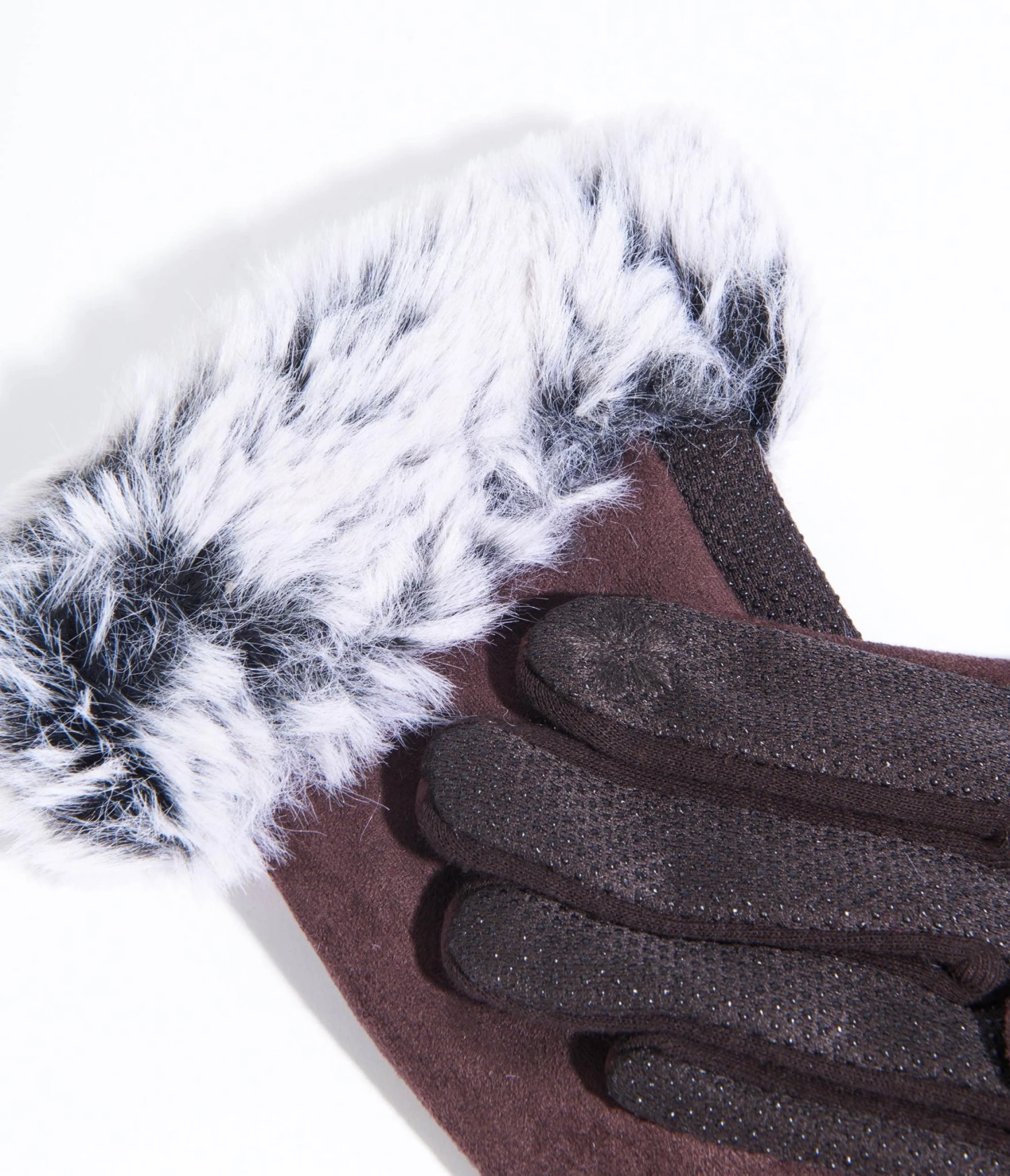 These ravishing gloves feature a soft brown faux suede construction, topped by a grey flared faux fur cuff. The smart touchscreen technology on the pointers allow easy texting. Stay comfortable and in touch all night long!
