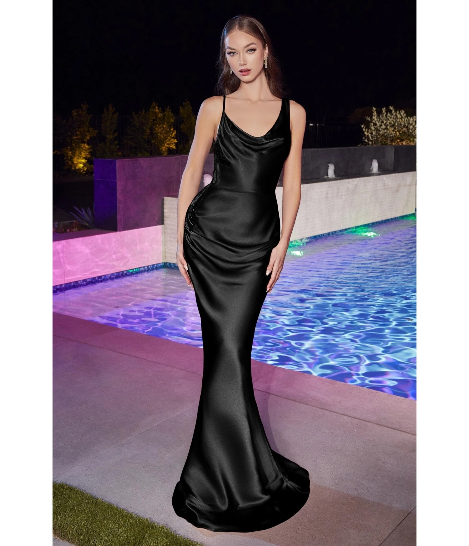 This unforgettable gown is set in a beautiful black satin, hugging your curves in all the right places. The cowl neckline offers a tantalizing hint of elegance while the thin straps draw attention to your delicate shoulders. Complete with a sexy lace-up back and a floor length fitted skirt with a sweep train.