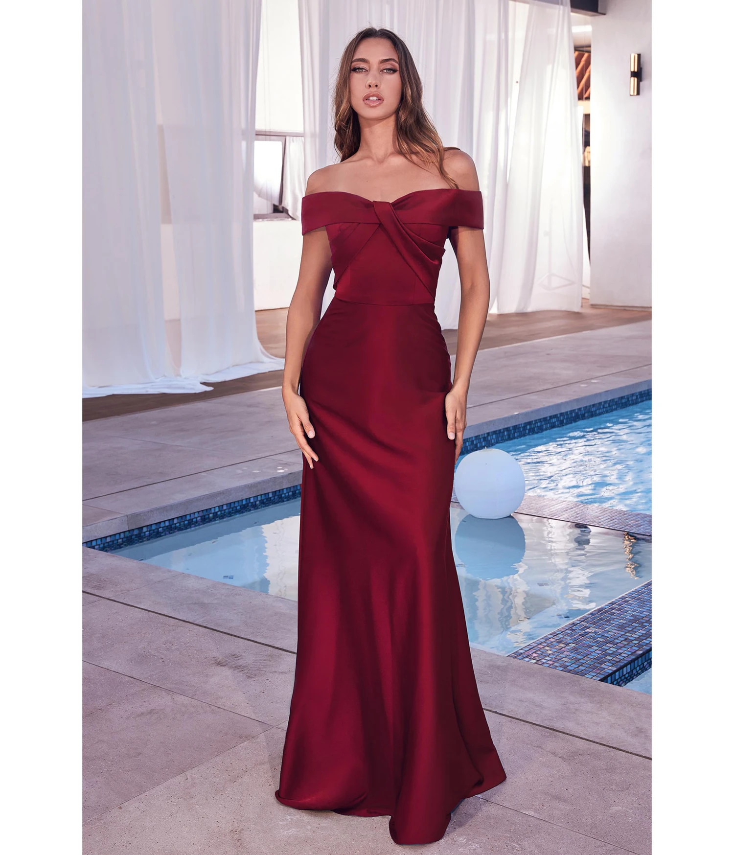 Cinderella Divine Burgundy Satin Off The Shoulder Prom Gown