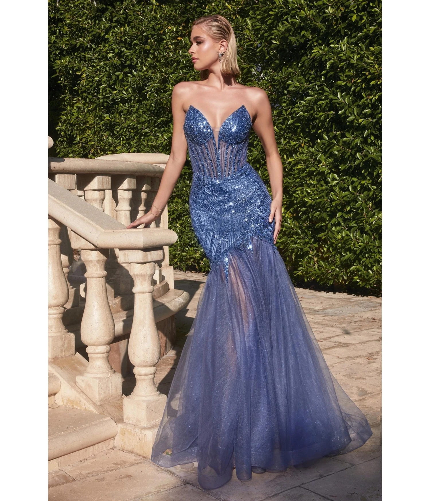 Cinderella Divine Lapis Blue Beaded Sequin Strapless Mermaid Prom Dress