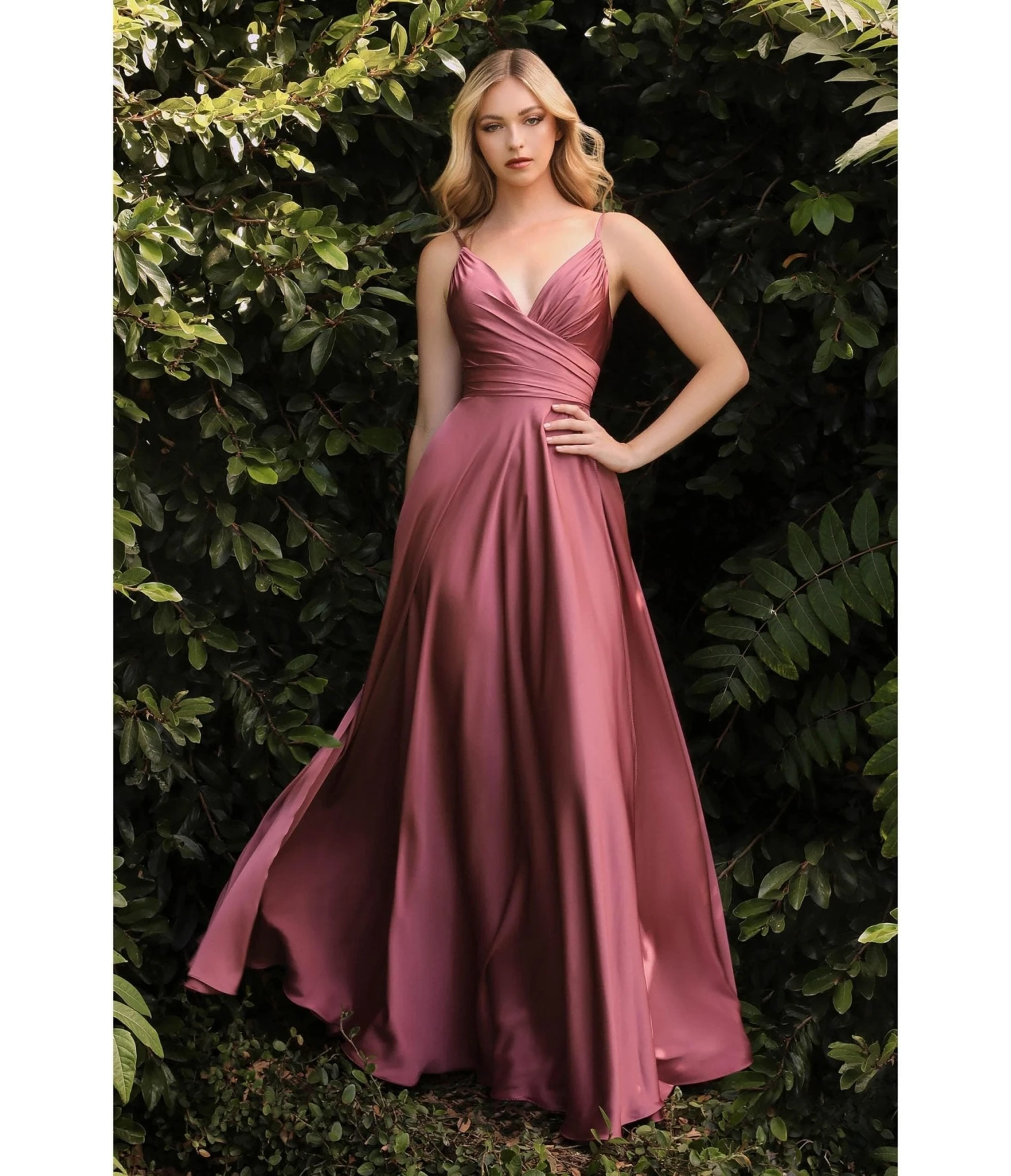 This gorgeous mauve rose satin gown features spaghetti straps with a deep V-neckline accentuated by the faux wrap ruched bodice. While the full length skirt boasts a sultry side slit.