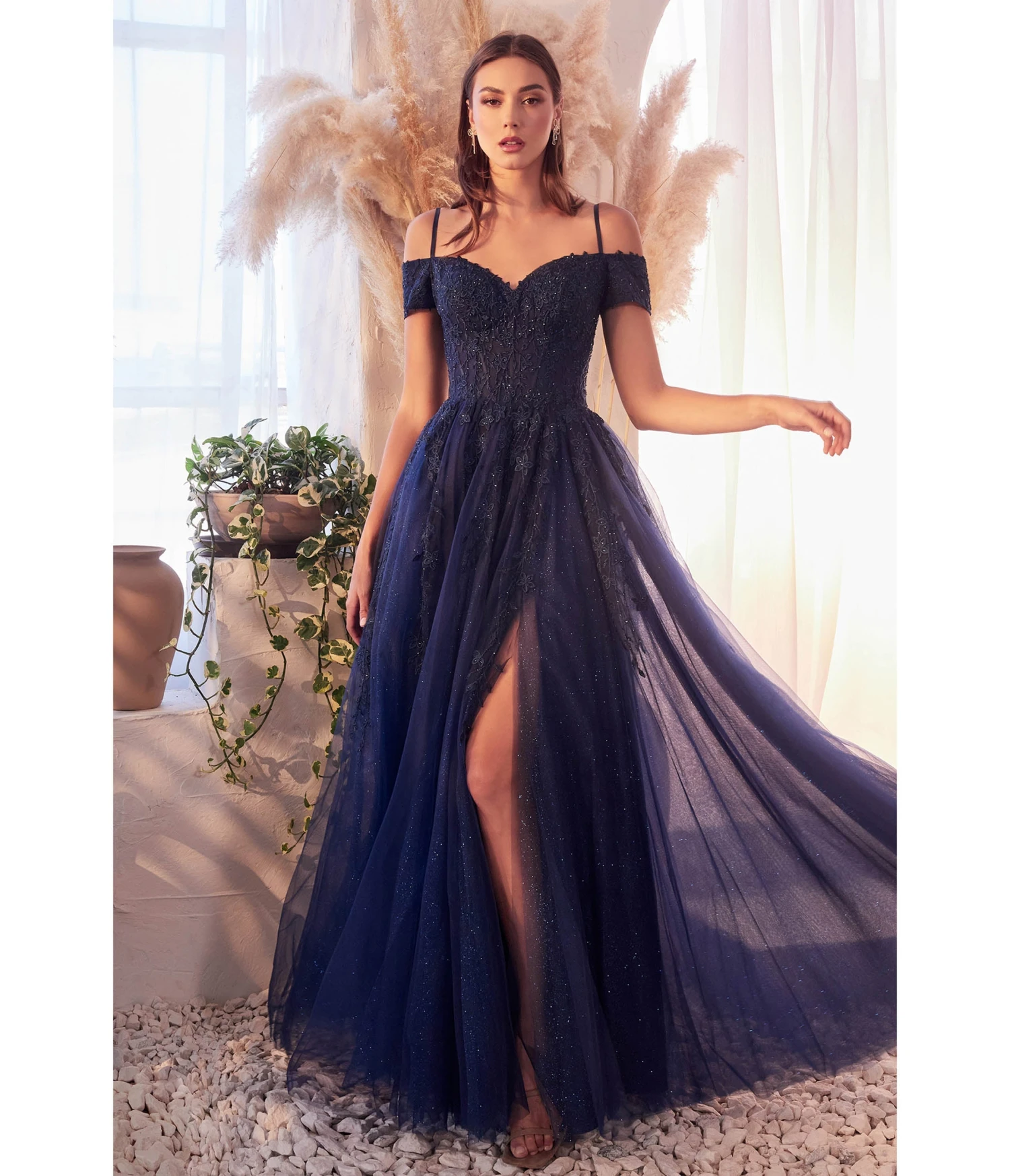 Cinderella Divine Navy Glitter Tulle Off The Shoulder Applique Slit Gown