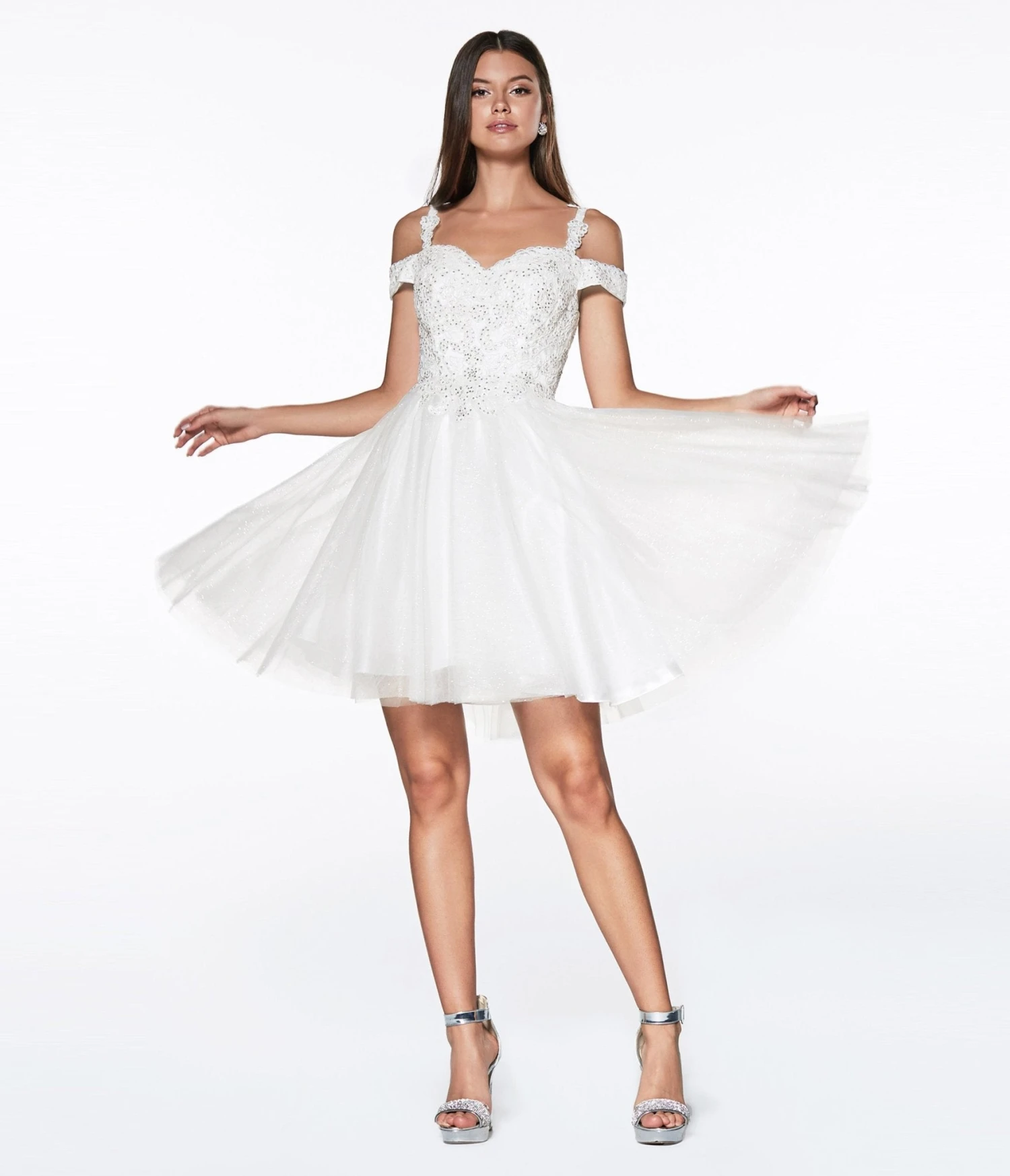 Cinderella Divine Off White Glitter Tulle Cold Shoulder Homecoming Dress