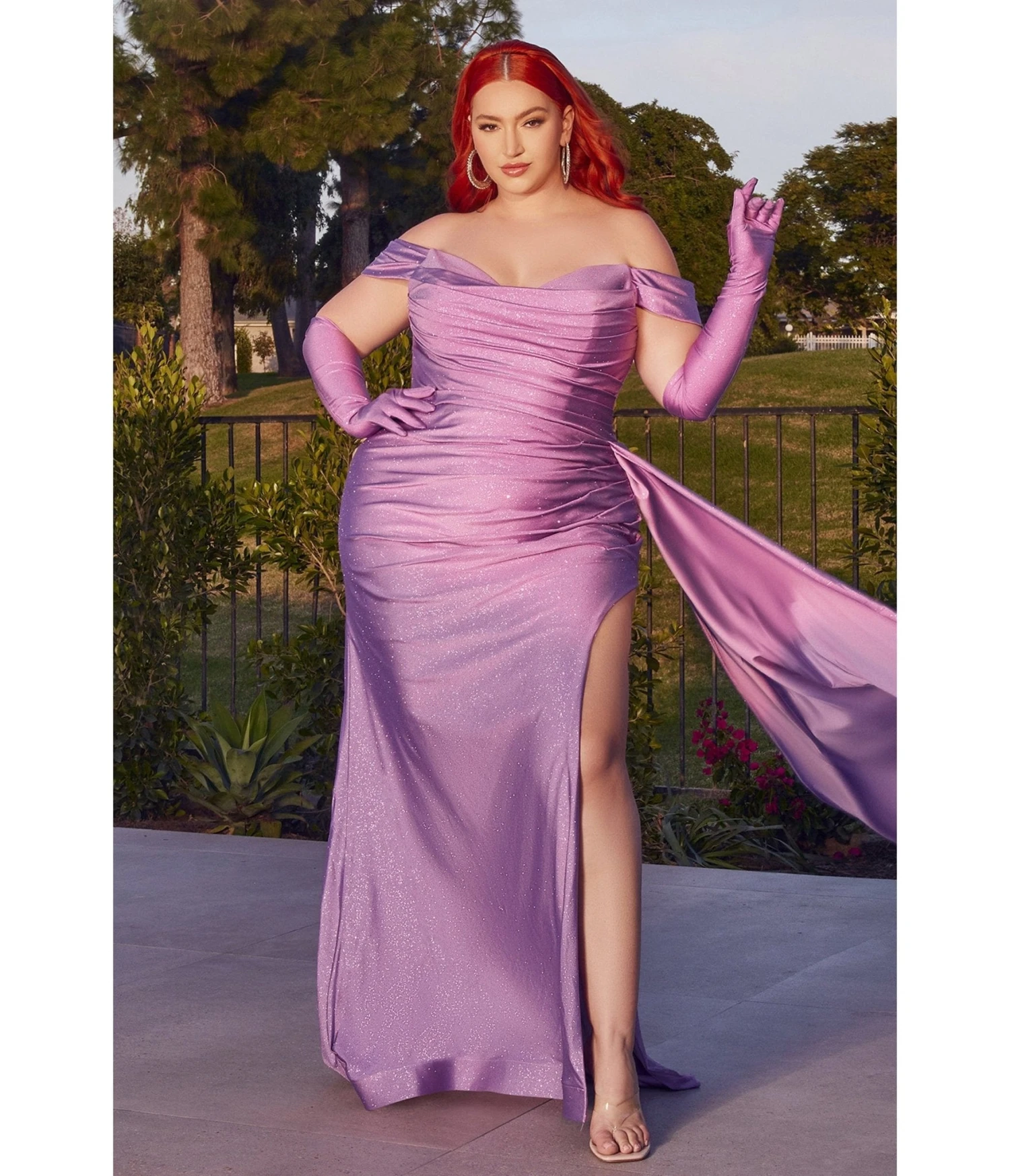 This stunning plus size lilac dress was born to shimmer throughout the night, set in a beautiful stretch glitter satin. The gathered waistline accentuates the sweetheart off the shoulder neckline perfectly. The dramatic leg slit is perfectly paired with a flowing side sash. Complete with matching gloves for a polished look!