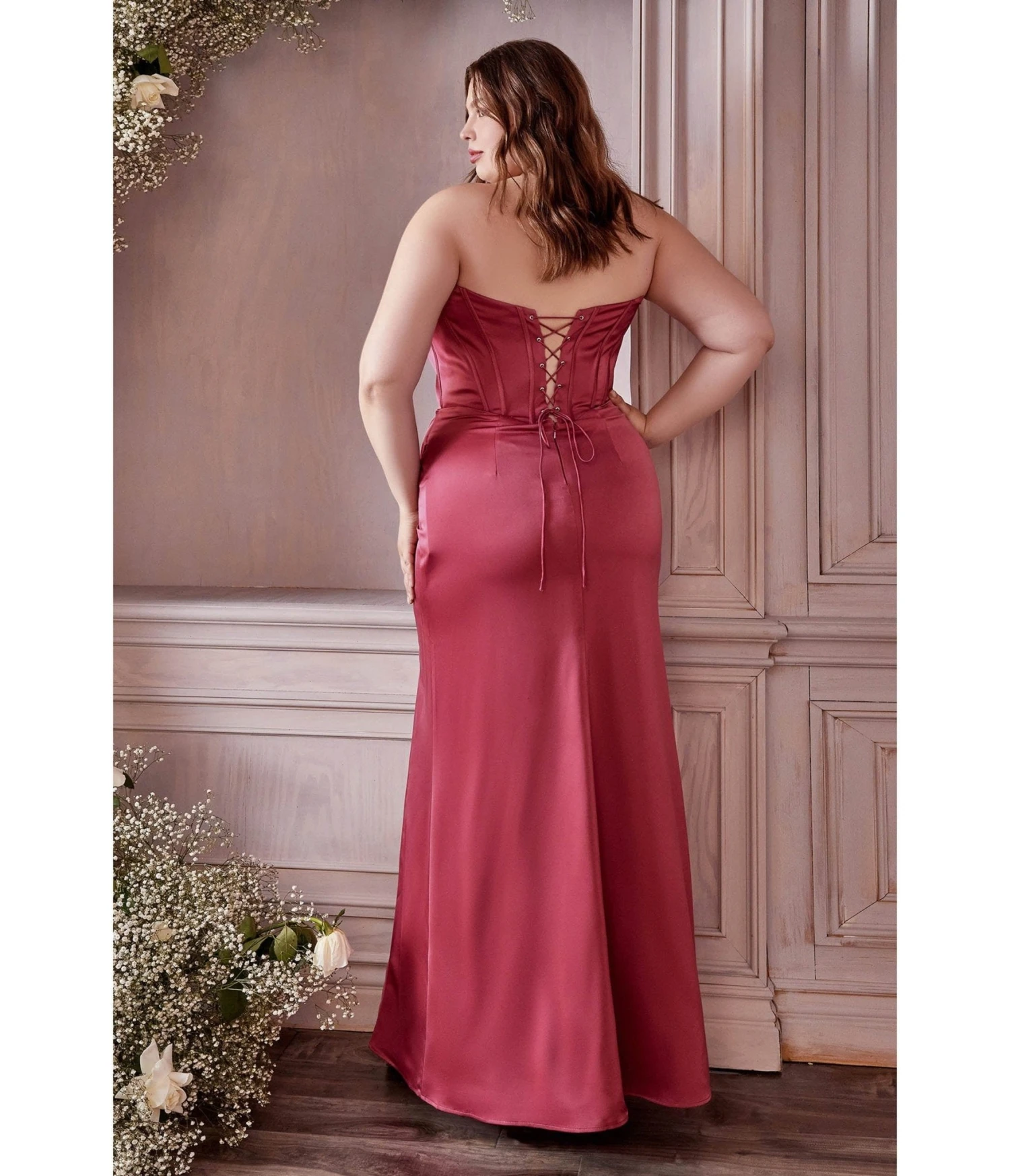 Dazzle the dance floor in this plus size dark rose corset prom ball gown! This gown features an off the shoulder neckline with draping straps and a fitted boned bodice. The lace up detailed back will accentuate your form while the sheath skirt flows to the floor and features a side slit.