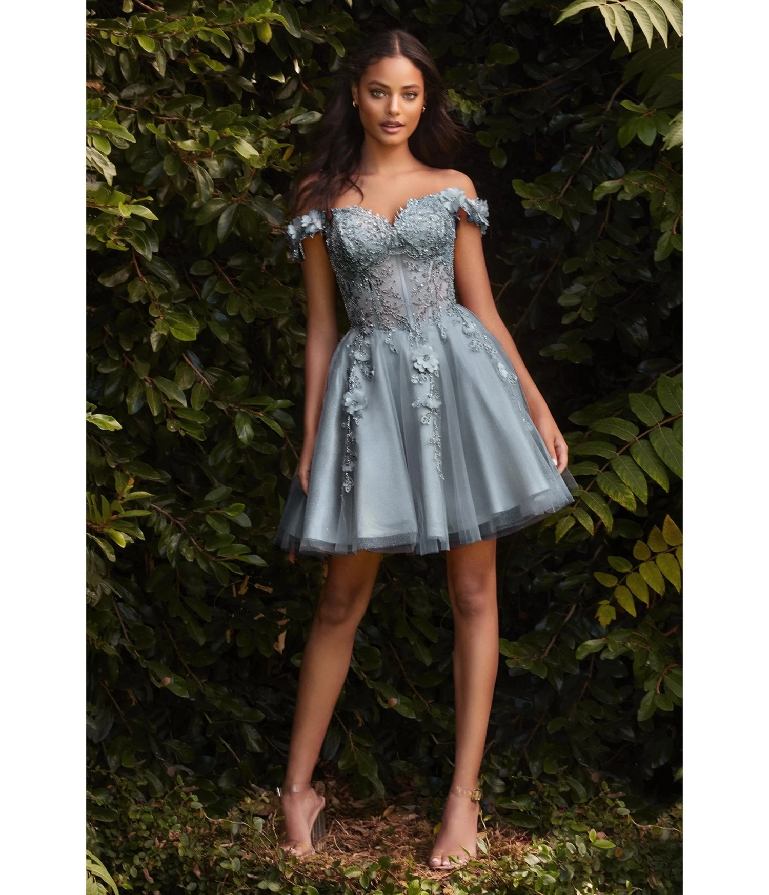 Crafted to perfection, this exquisite piece radiates sheer luxury. Prepare to turn heads as you make a grand entrance wearing this smoky blue colored masterpiece. Its sweetheart corset bodice is adorned with delicate beads and resplendent 3D floral lace appliques, captivating all who behold its beauty. A tantalizing off the shoulder silhouette, complemented by intricate floral straps, adds a touch of allure that is unparalleled in elegance. Embrace sophistication with its enchanting open back design, flawlessly accentuated by a sleek back zipper for convenience and style. The short A-line glitter tulle skirt gracefully sways with every step you take – an ethereal ensemble that will leave everyone breathless in wonderment.