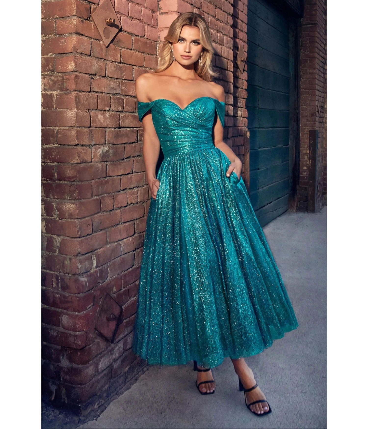 Cinderella Divine Turquoise Glitter Off The Shoulder Tea Length Dress