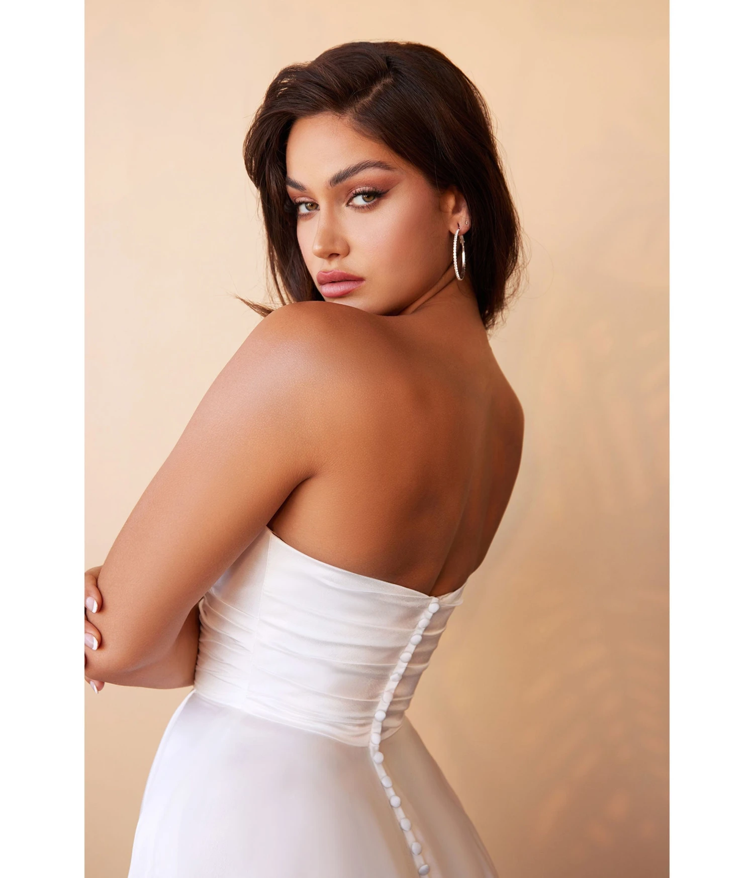 Crafted with utmost precision, this exquisite masterpiece features a mesmerizing strapless pleated sweetheart bodice that accentuates your natural beauty effortlessly. The alluring open back, adorned with delicate covered buttons, adds an element of tasteful sensuality. As you walk down the aisle, the floor length A-line skirt graciously glides around you, revealing a subtle side leg slit that embodies both poise and daring. Complete with a sweep train trailing behind like whispers of enchantment, this gown is every luxurious bride’s dream come true.