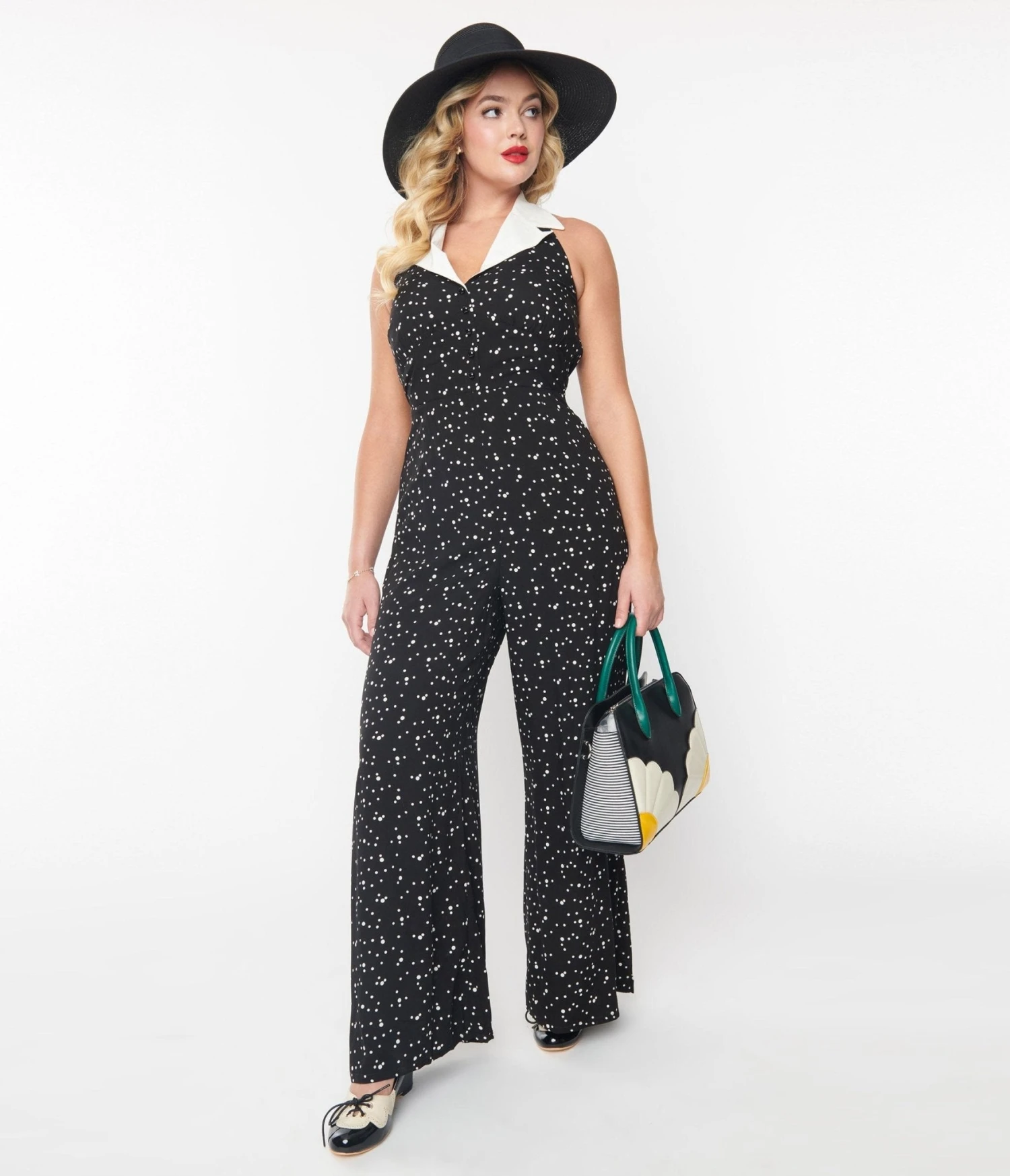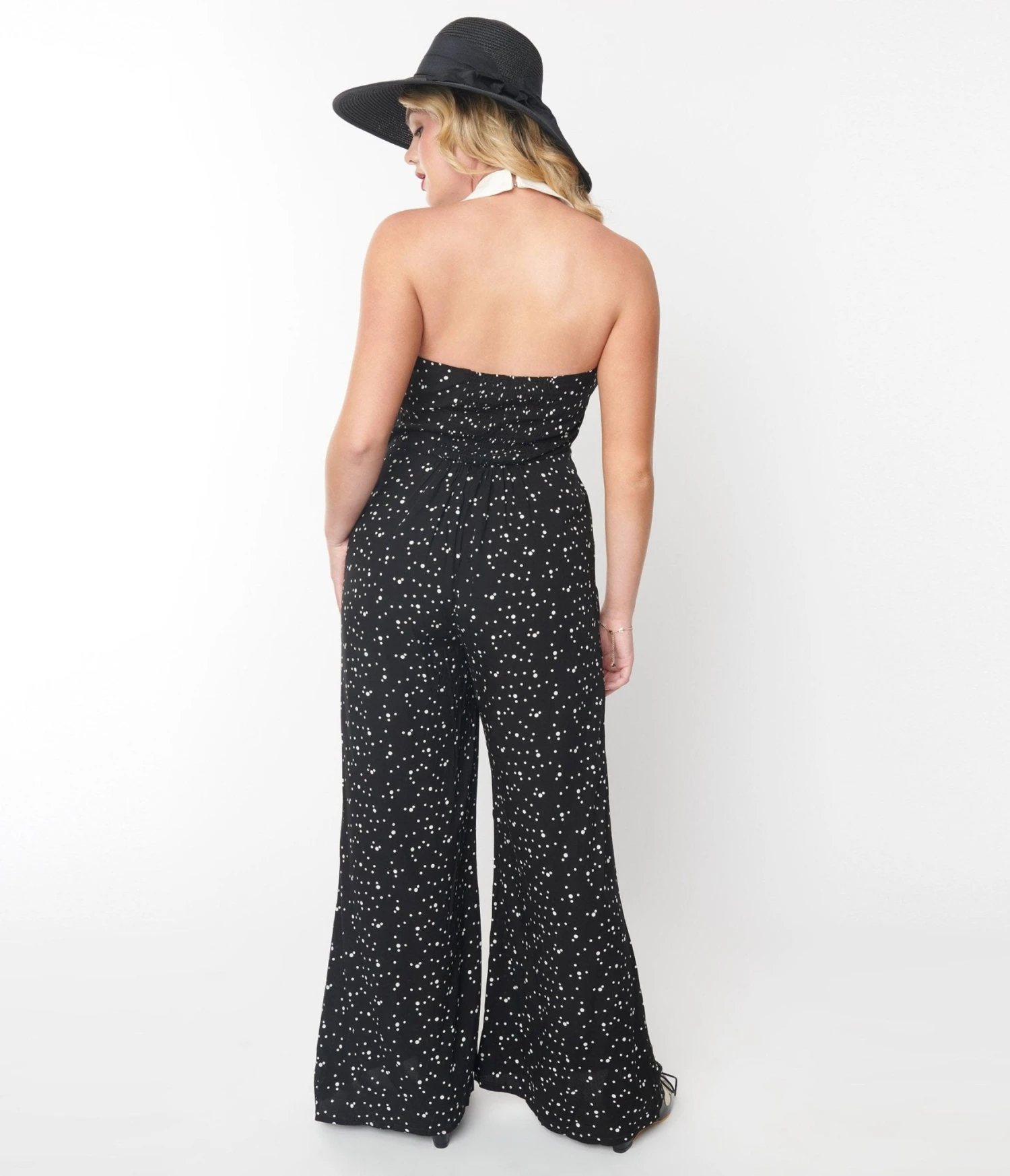 Stay stylish this season in this charming black sleeveless 1970s style jumpsuit from Collectif, boasting white dots throughout. The button-up front is faux-partian creating a timeless appeal that is sure to be a showstopper. With a side zipper and smocked back, this jumpsuit is both comfortable and stylish. The white contrast collared halter neckline enhances your look, making it the perfect choice for any occasion.