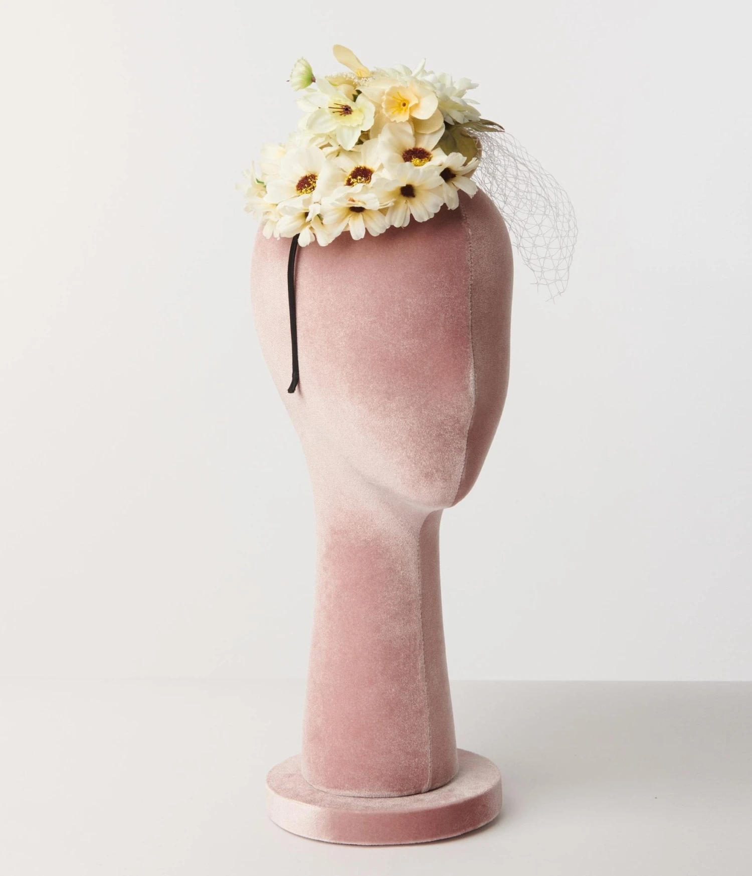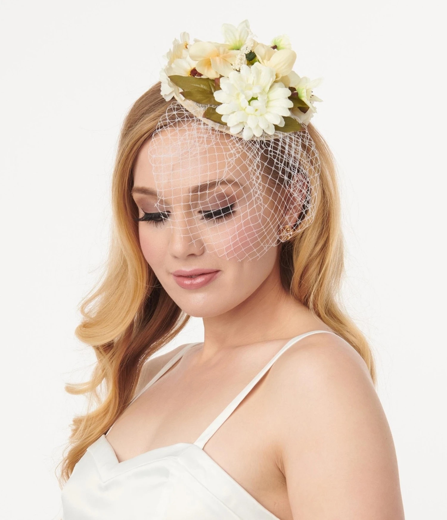 1960s inspired fascinator with white netting and cream florals. Complete with alligator clip and headband.