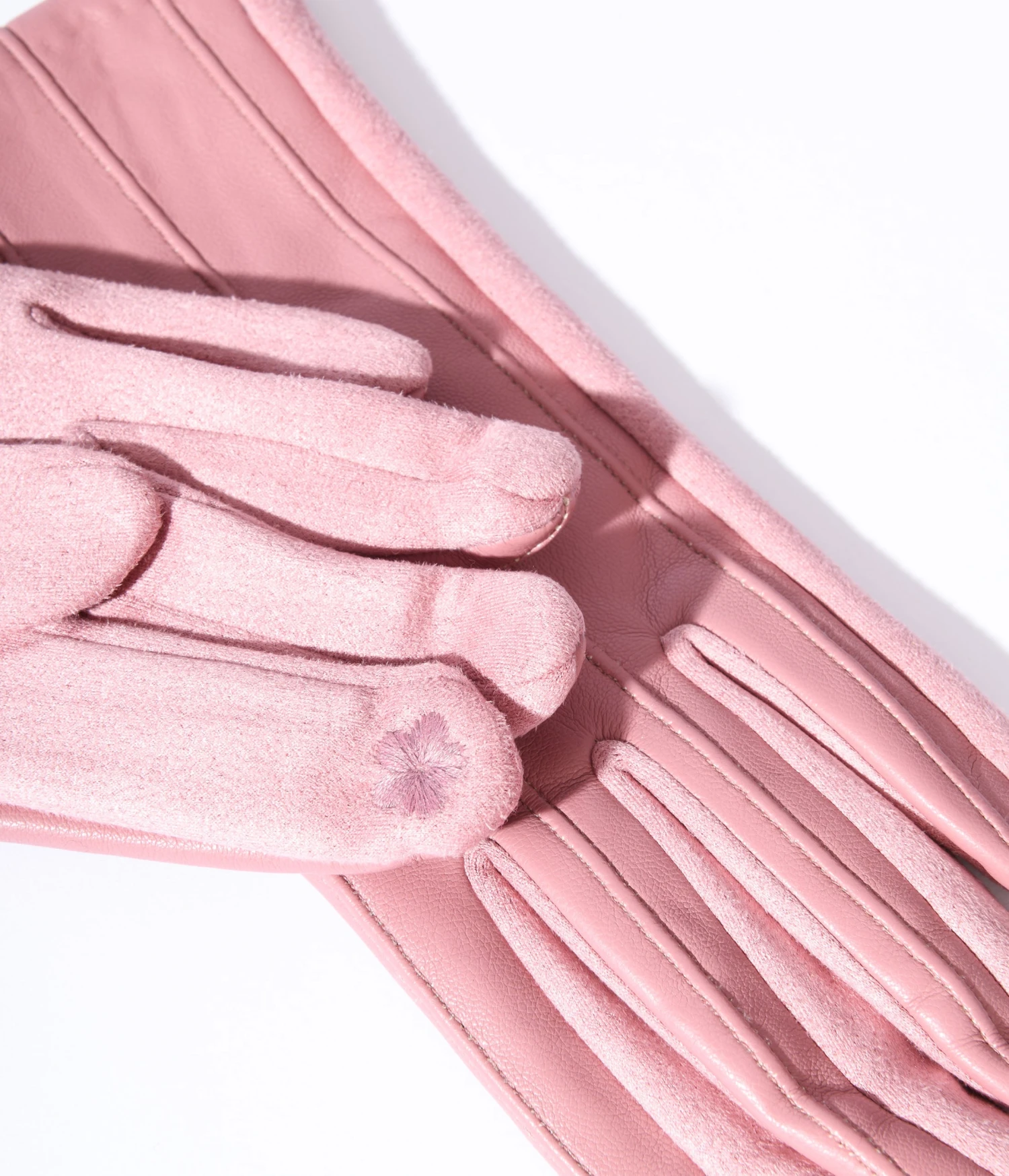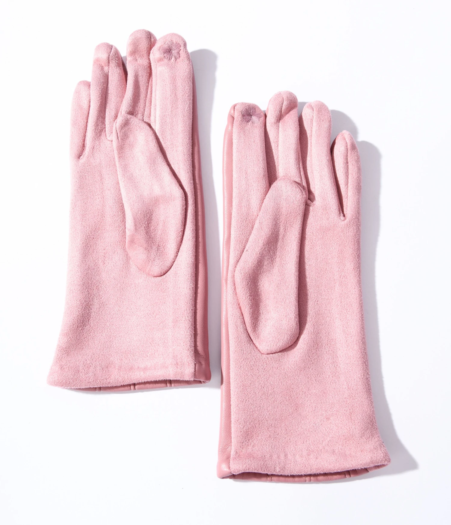These dusty pink gloves are a trendy combination of soft suede and luxurious leatherette that will make you the star of any occasion. Adorned with delicate flower stitching on the pointer finger and thumb, these gloves add a touch of elegance to your ensemble.