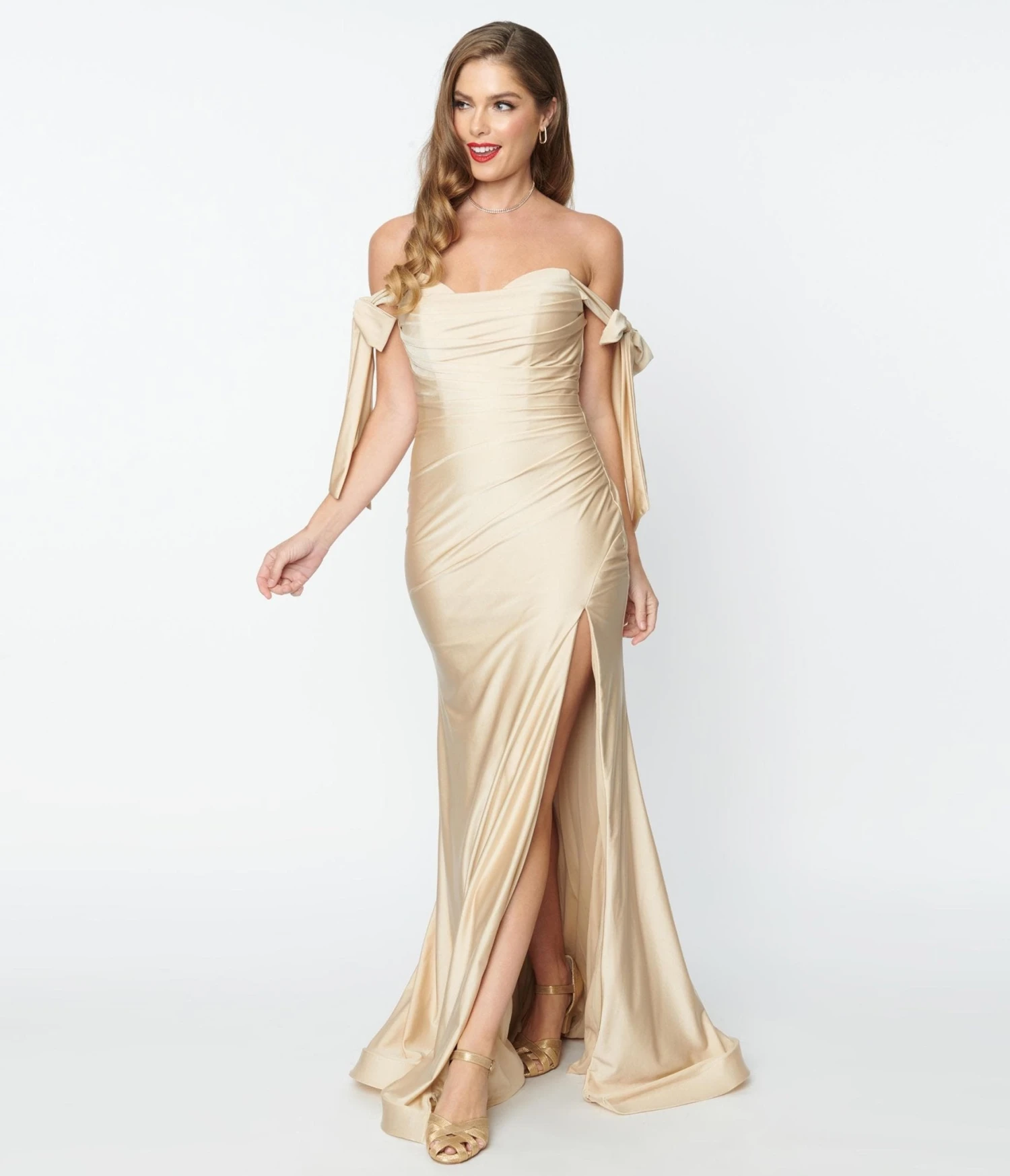 This gorgeous gown is crafted in a dazzling champagne satin. The ruched bodice is accented with self tie off the shoulder straps, while the maxi length skirt boasts a short train and sultry side slit. Outfitted with a back zipper!