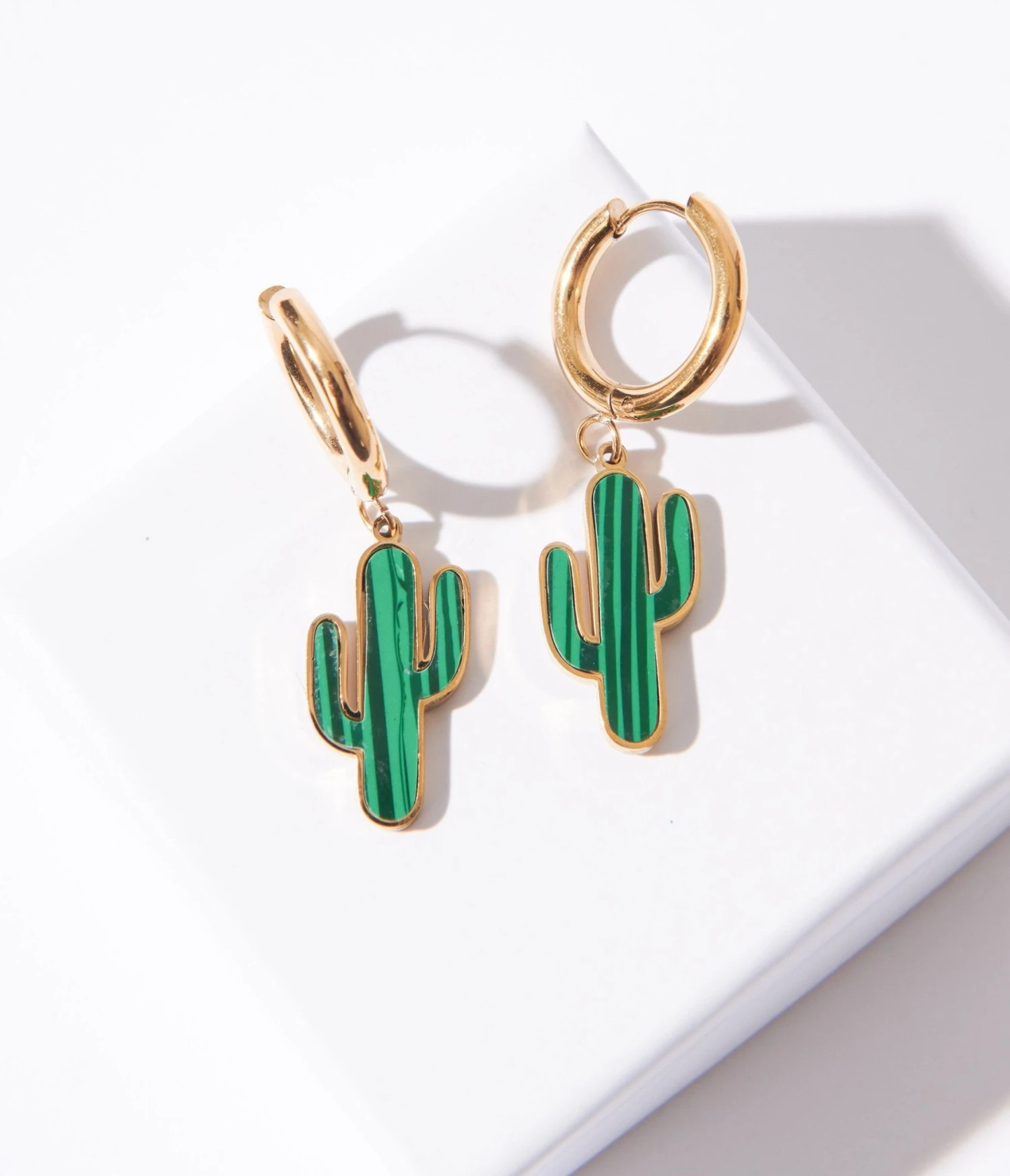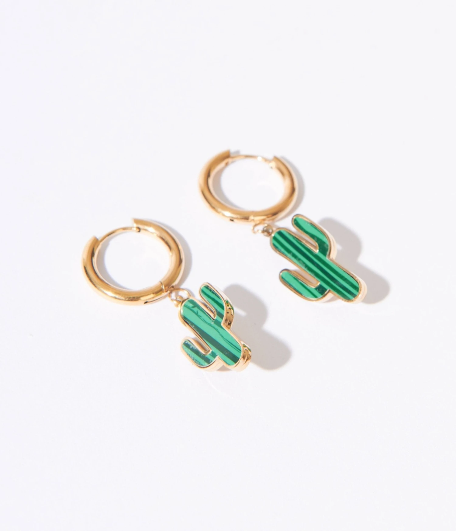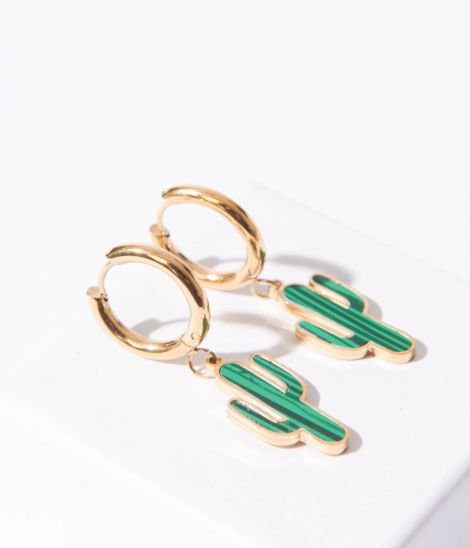 These stainless steel gold hoops feature a vibrant green enamel cactus-shaped drop, adding an exciting touch of desert glamour to any outfit. Complete with a hinge closure.