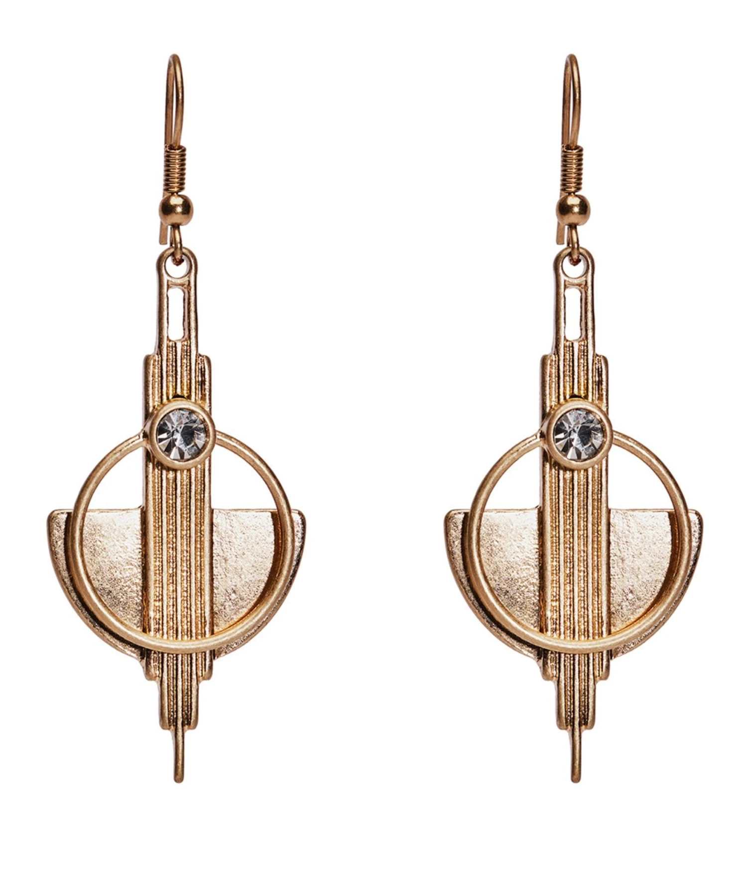 These stunning drop earrings are crafted in golden hardware and set in a dazzling art deco design, complete with a silver rhinestone. Secured with hinge hook backs.