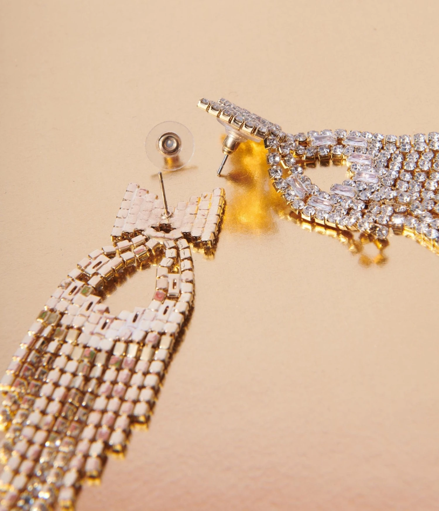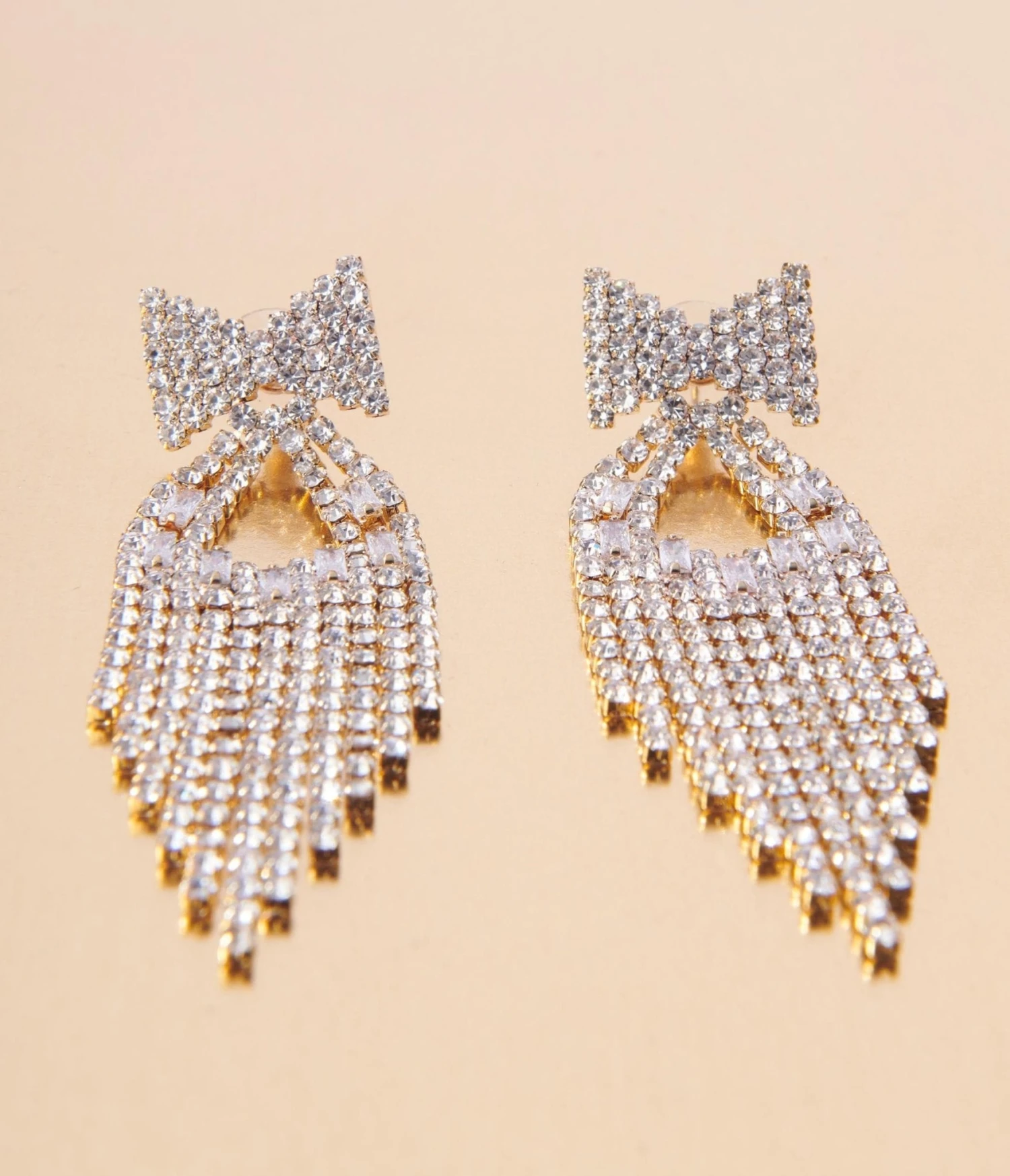 These dazzling dangle earrings feature an adorable bow crafted in golden hardware with rhinestones throughout and features fringed rhinestones dangling down.