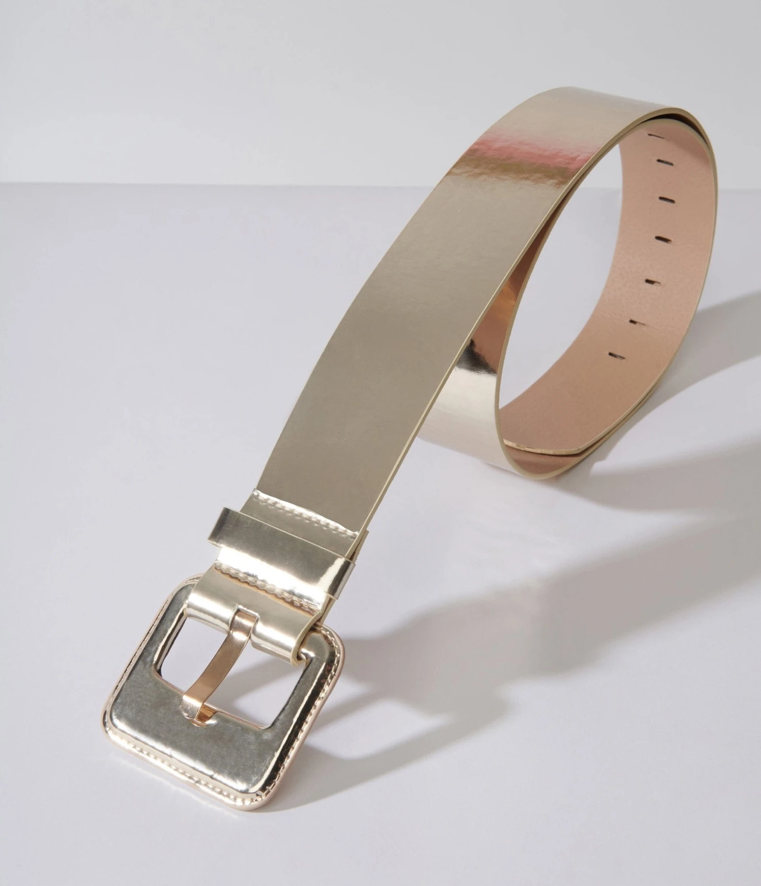 Shine bright and show off your curves with this belt! Crafted in a shiny gold PU and featuring a square buckle.