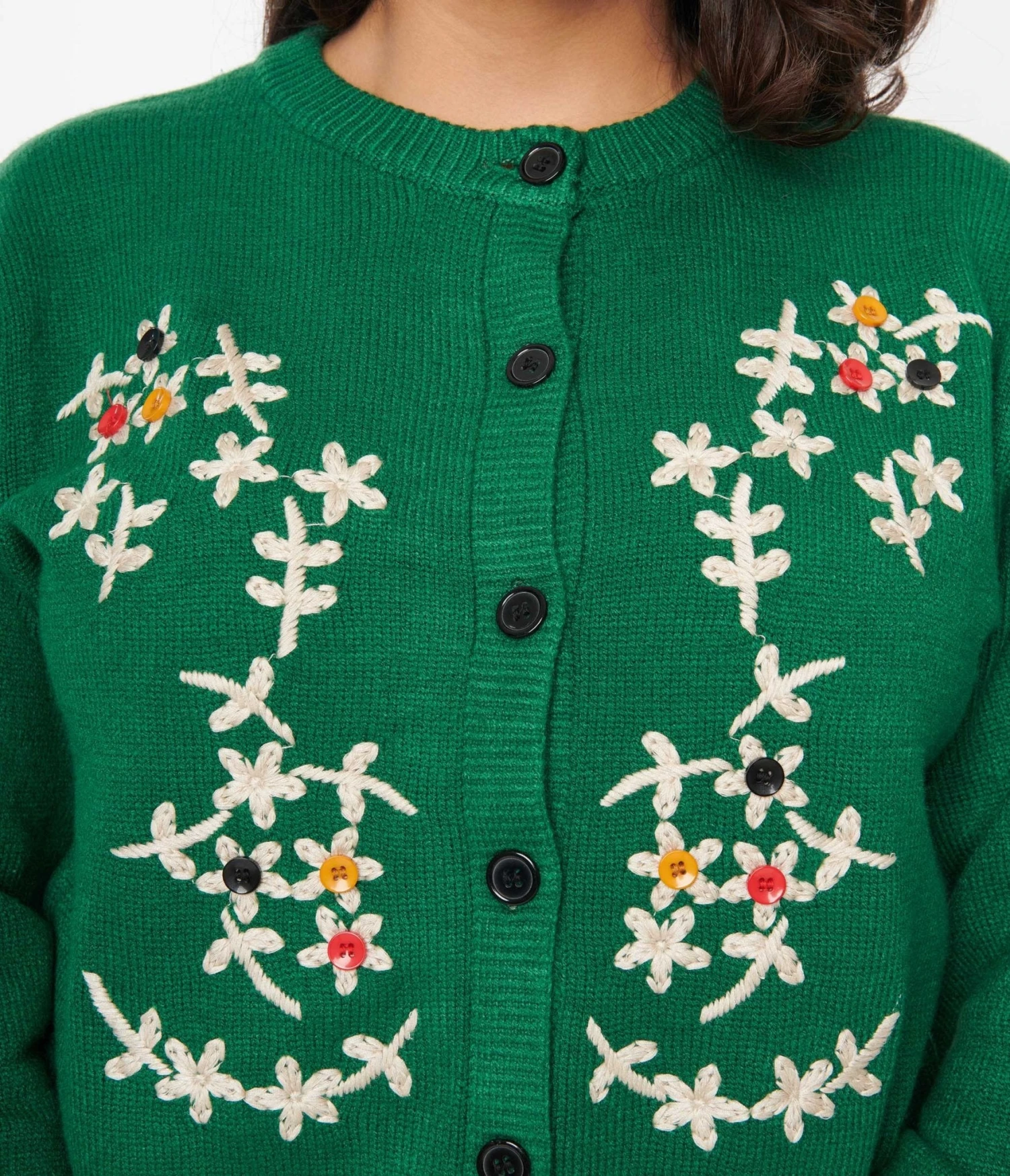 This vibrant green sweater knit cardigan is adorned with stunning embroidered ivory flowers, some featuring a captivating multicolored button center. Its long sleeves and scoop neckline add an extra touch of elegance, making it the perfect piece for both festive gatherings and cozy nights by the fireplace. With its easy-to-wear button-up design, you can effortlessly layer it over your favorite tops or dresses to create endless stylish ensembles.