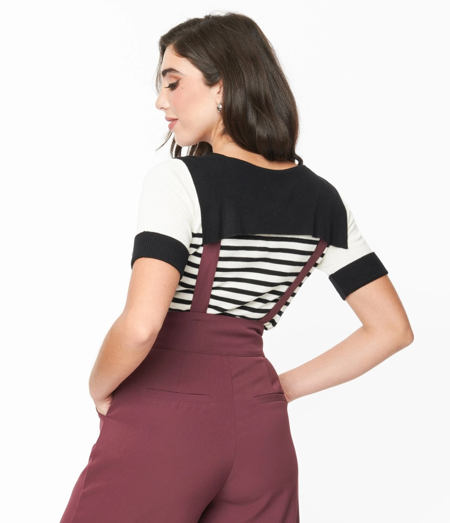 This edgy and exciting 1950s style piece will instantly elevate your style game. Made from a comfortable knit fabric, this top features an eye-catching white and black stripe pattern that is bound to turn heads wherever you go. But wait, there’s more! The attached self-tie collar adds a touch of sophistication to this already trendy piece. With short sleeves, it’s perfect for those hot summer days or for layering under your favorite jacket in cooler seasons.