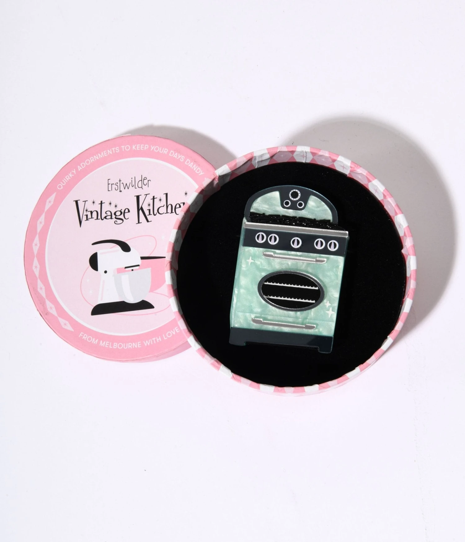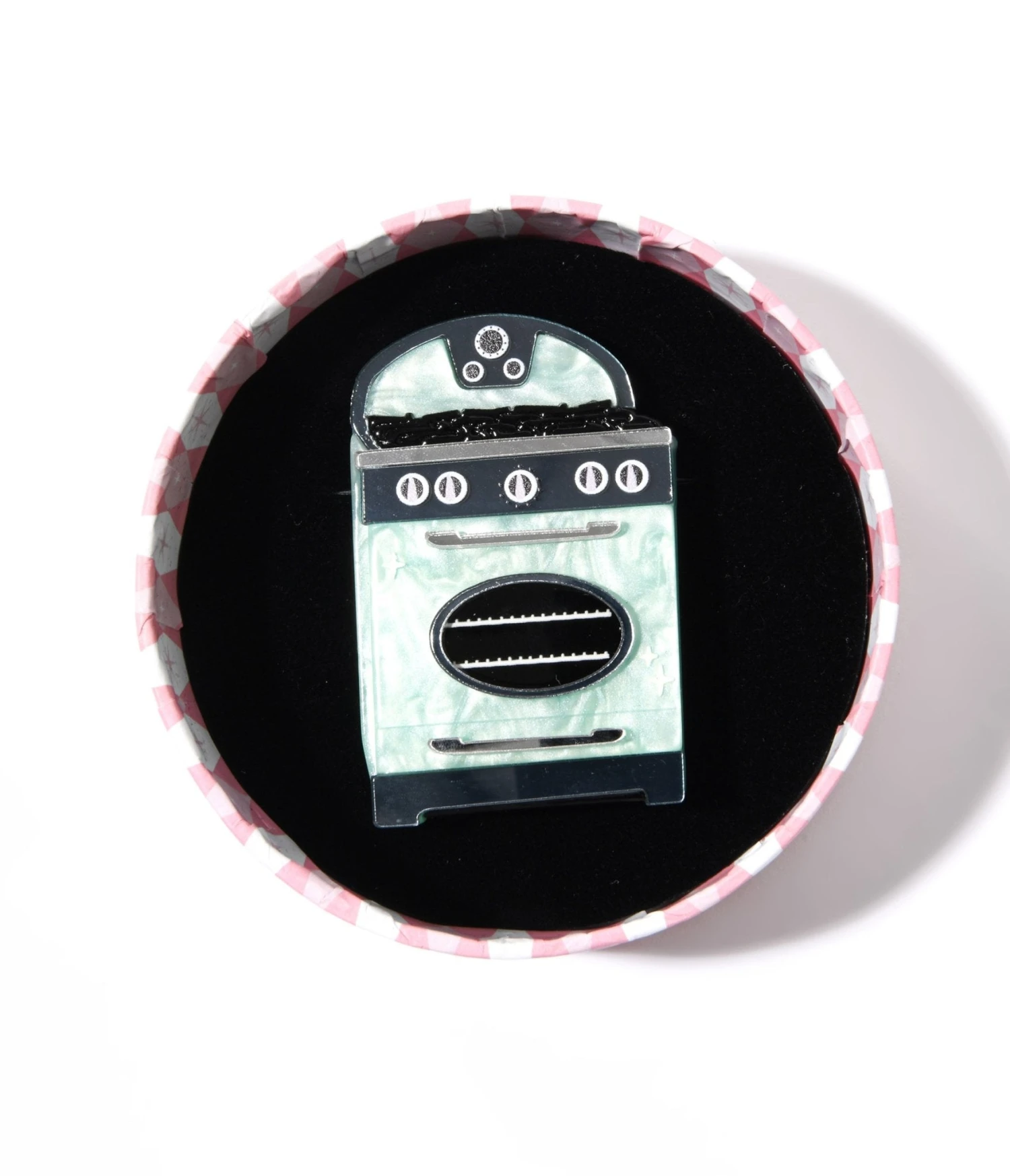 Get ready to take a delightful trip down memory lane! This whimsical piece is like a little slice of nostalgia, featuring a charming teal atomic oven design that will make any retro-loving heart skip a beat. Hand-assembled with love from high-quality resin, this brooch boasts intricate details achieved through the perfect combination of printing, epoxy coating, and etching. Complete with a safety pin back.