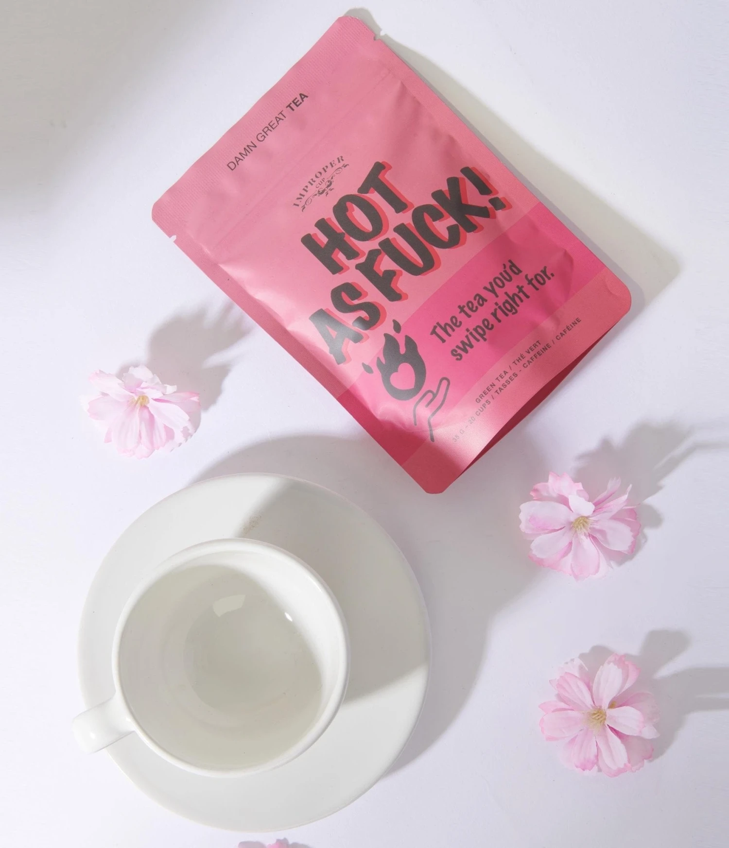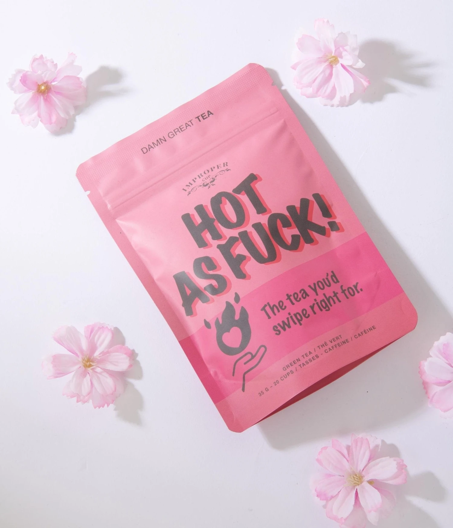When you’re feeling sassy but classy, reach for a nice cup of “Hot As Fuck!” tea! Made of a premium blend of green tea, jasmine petals, & natural flavors.
