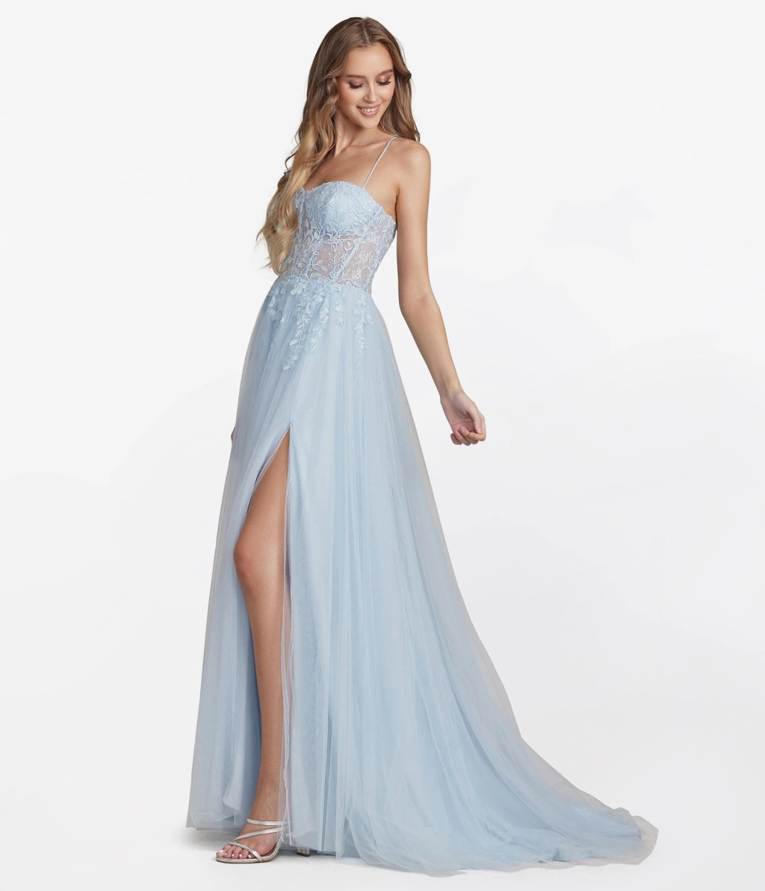 This long A-line prom dress is crafted in a gorgeous ice blue colored tulle fabric, topped by a bustier-style sheer-lace corset bodice with thin shoulder straps that criss-cross the open back. The romantic evening gown includes a multi-layered long skirt that gathers at the lacy waist before opening in a side slit and ending at the floor with a figure-flattering a-line shape.