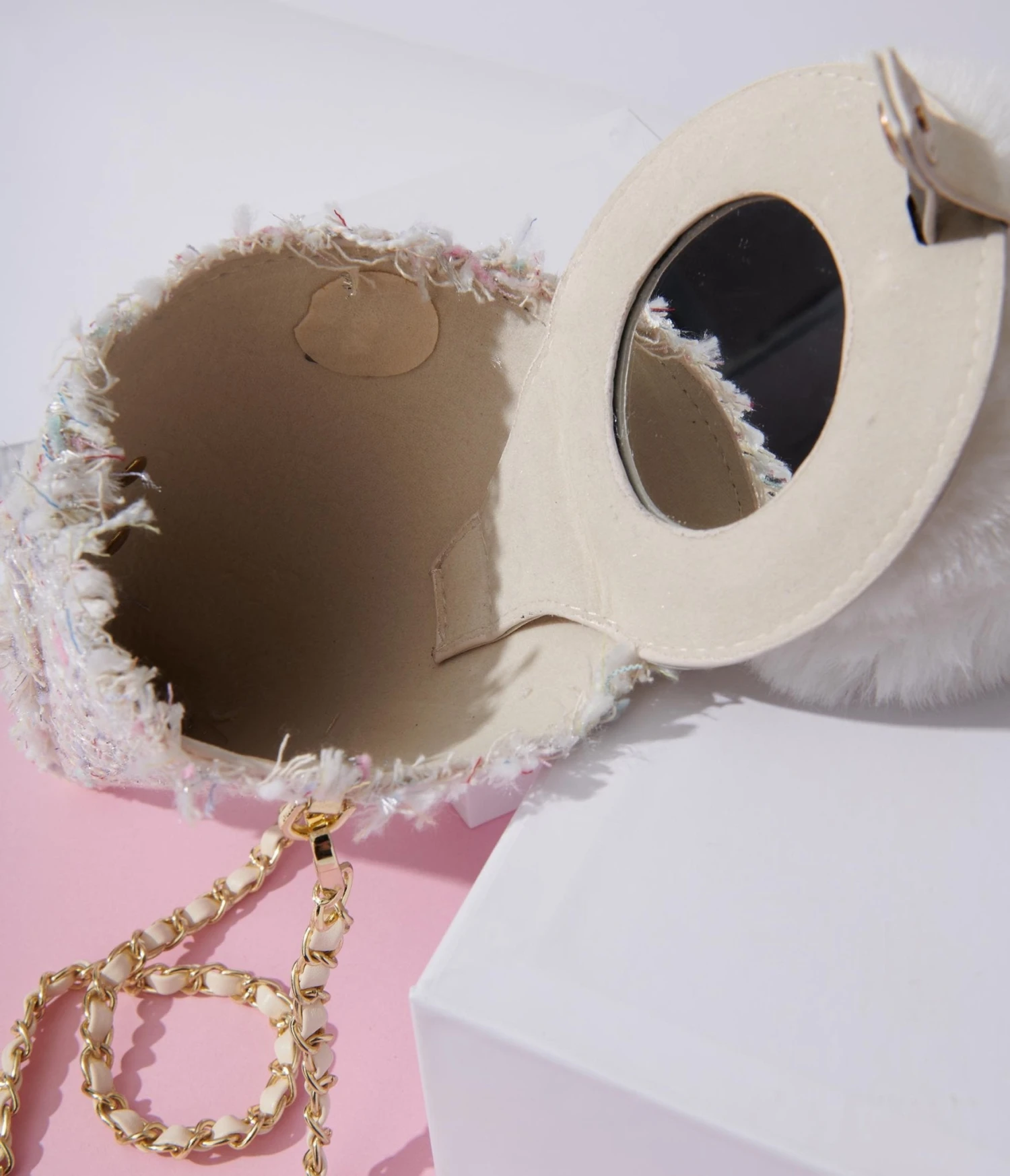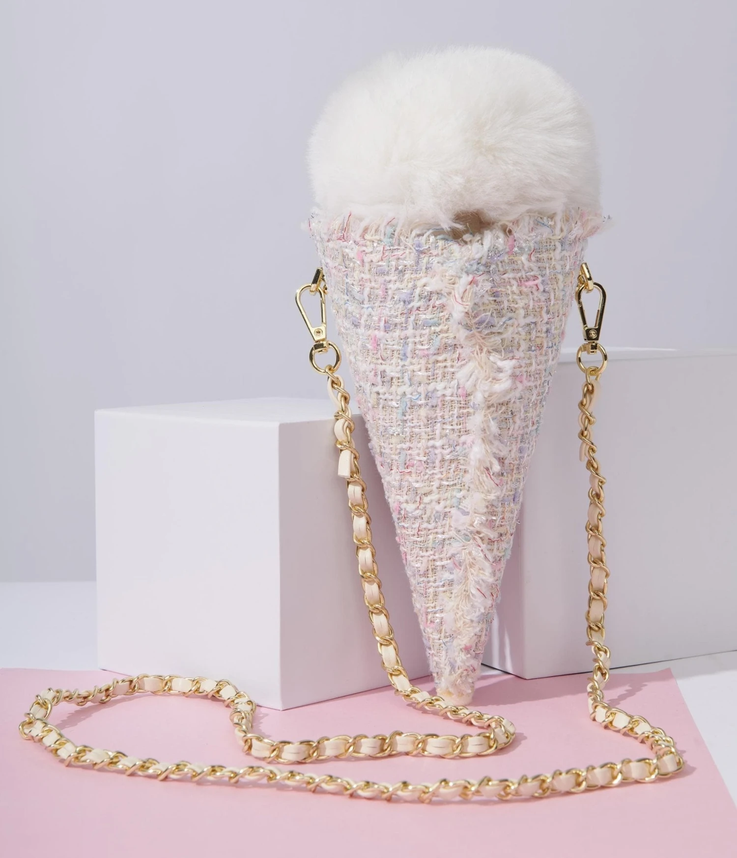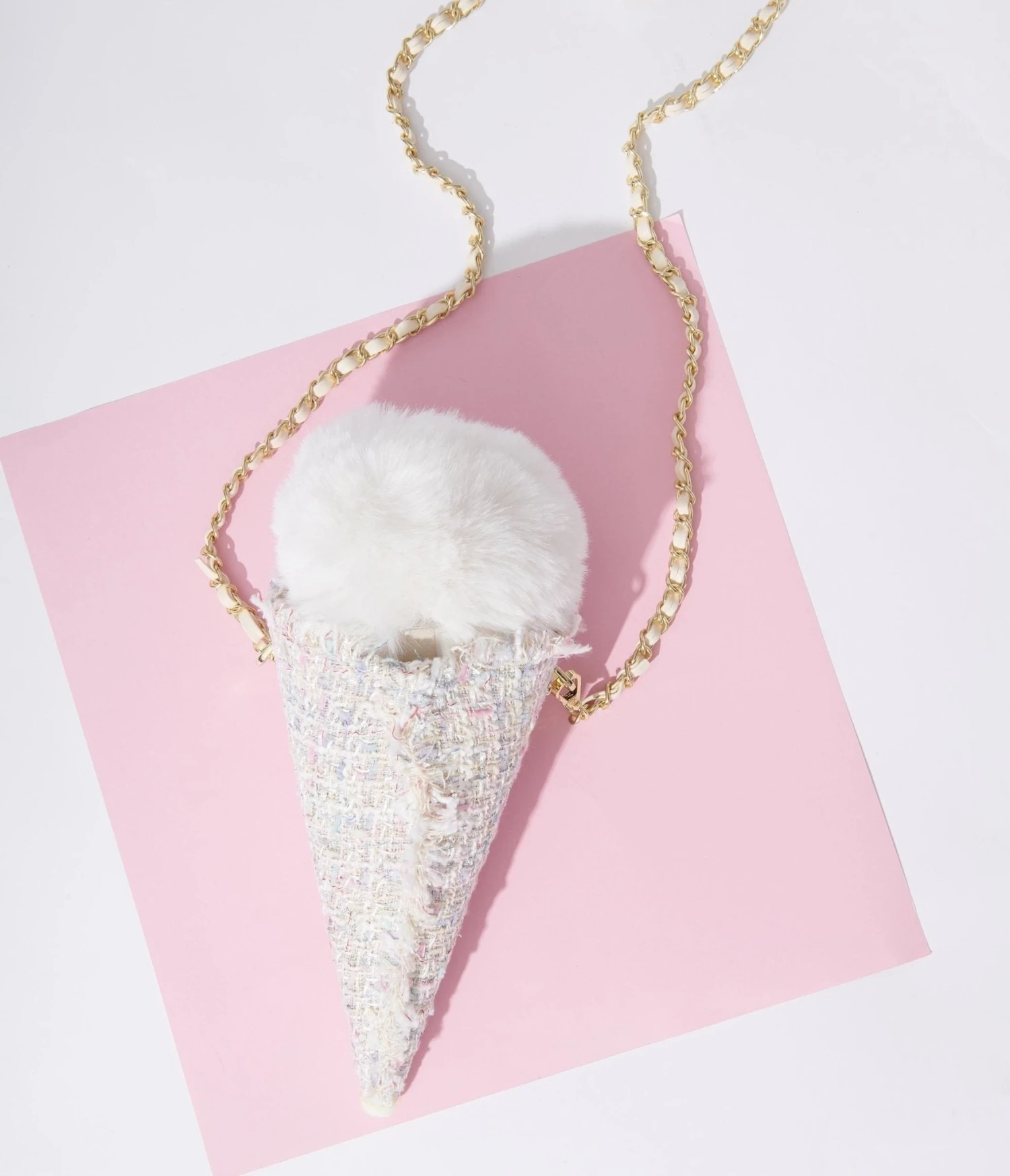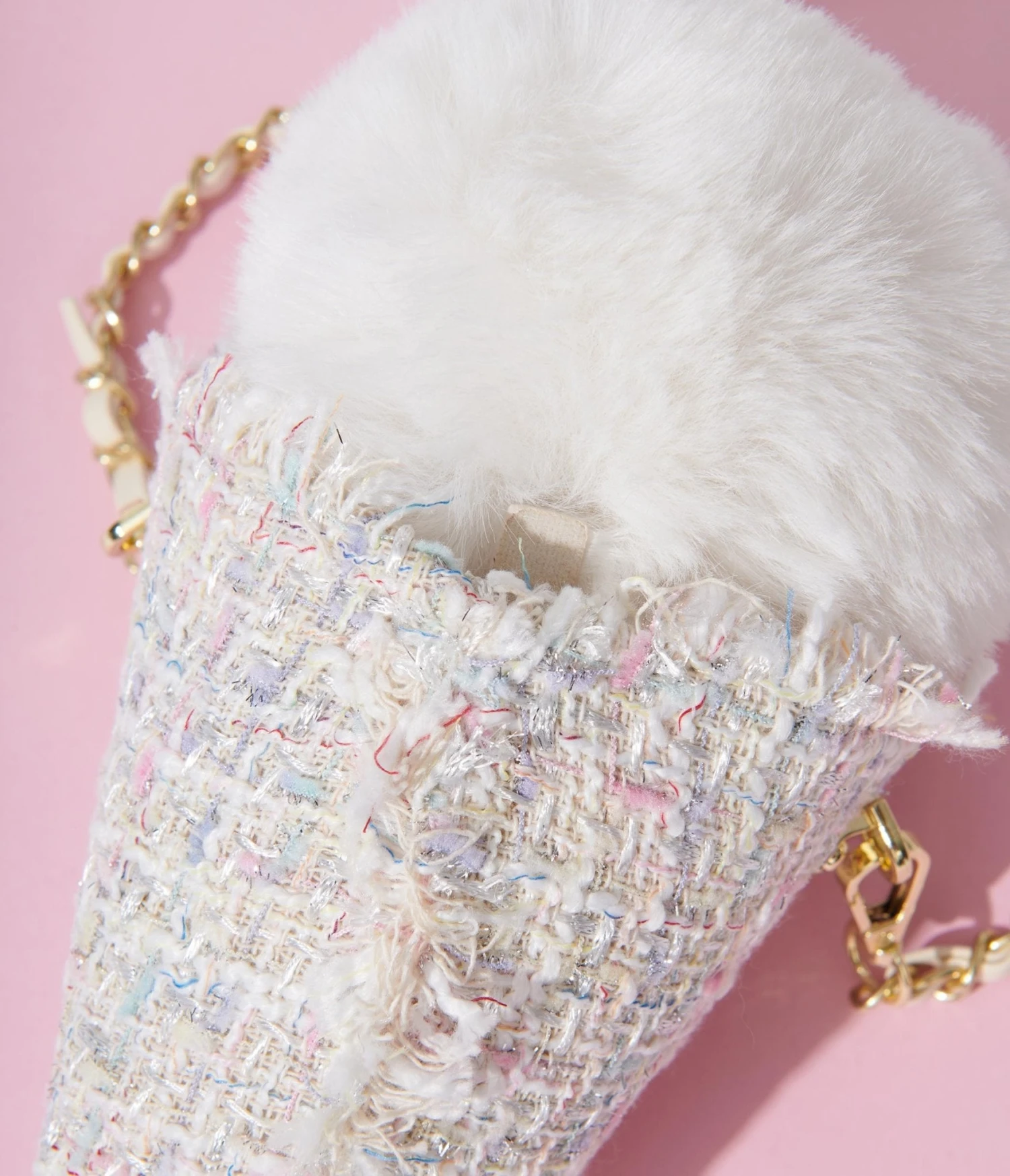 Sickly sweet, this ice cream shaped handbag is the perfect treat! Outfitted with a white fluff top and a pastel tweed cone bottom. Complete with an magnetic button closure, removable rope chain strap, and an inner mirror!