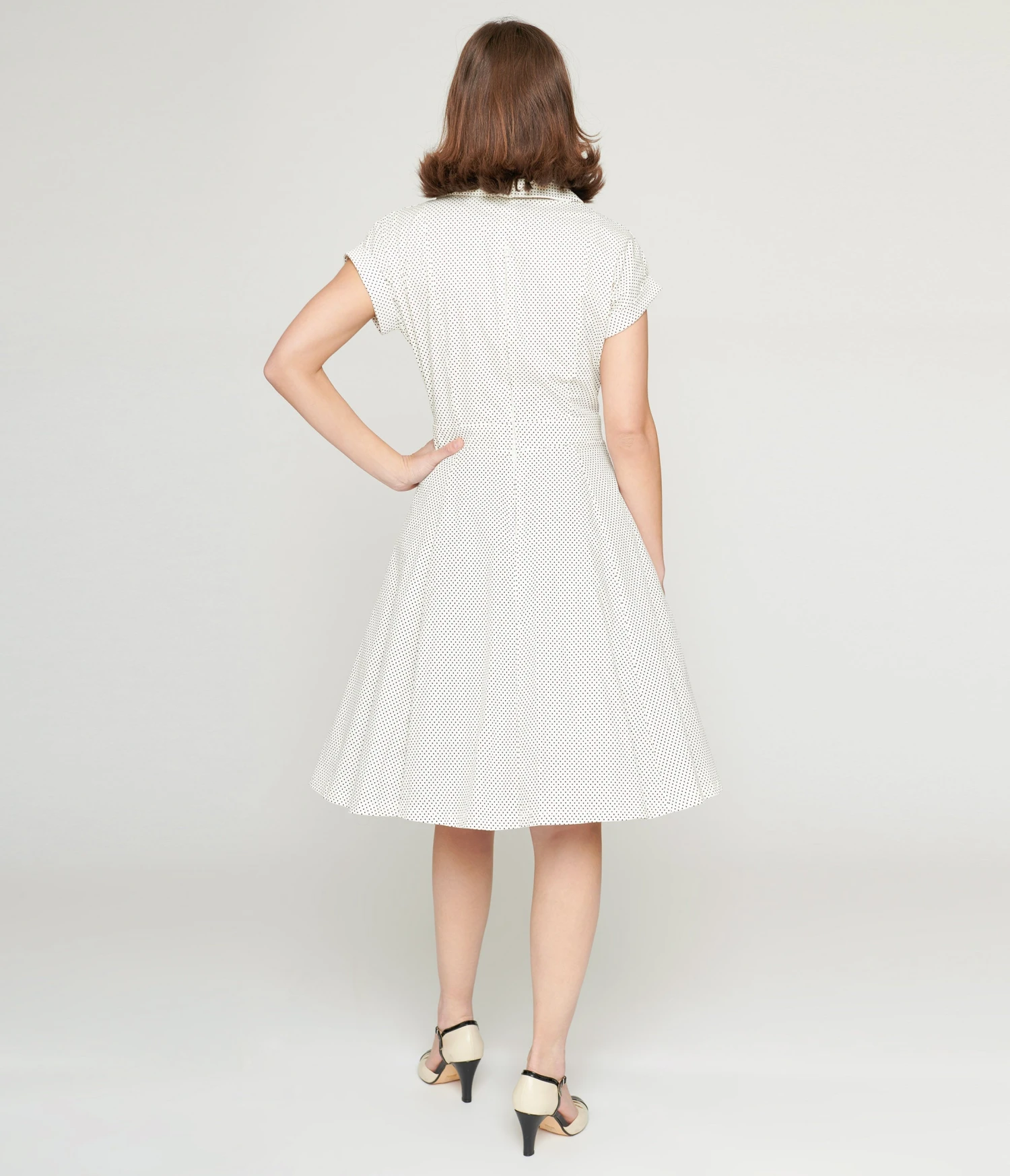 This charming 1950s style flare dress features a playful combination of ivory and black polka dots, perfect for adding some fun to your wardrobe. The button-down front adds a touch of vintage flair, while the attached circle belt buckle cinches in your waist for a flattering silhouette. With short sleeves and a back zipper, getting dressed has never been easier. The collared neckline adds an elegant touch, while the side pockets provide practicality without sacrificing style.