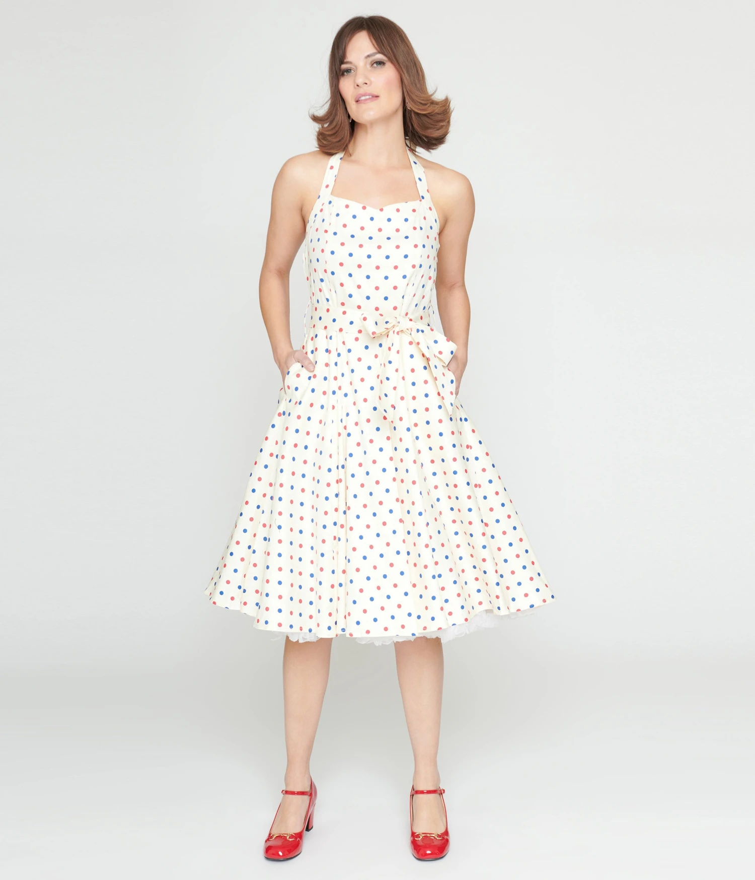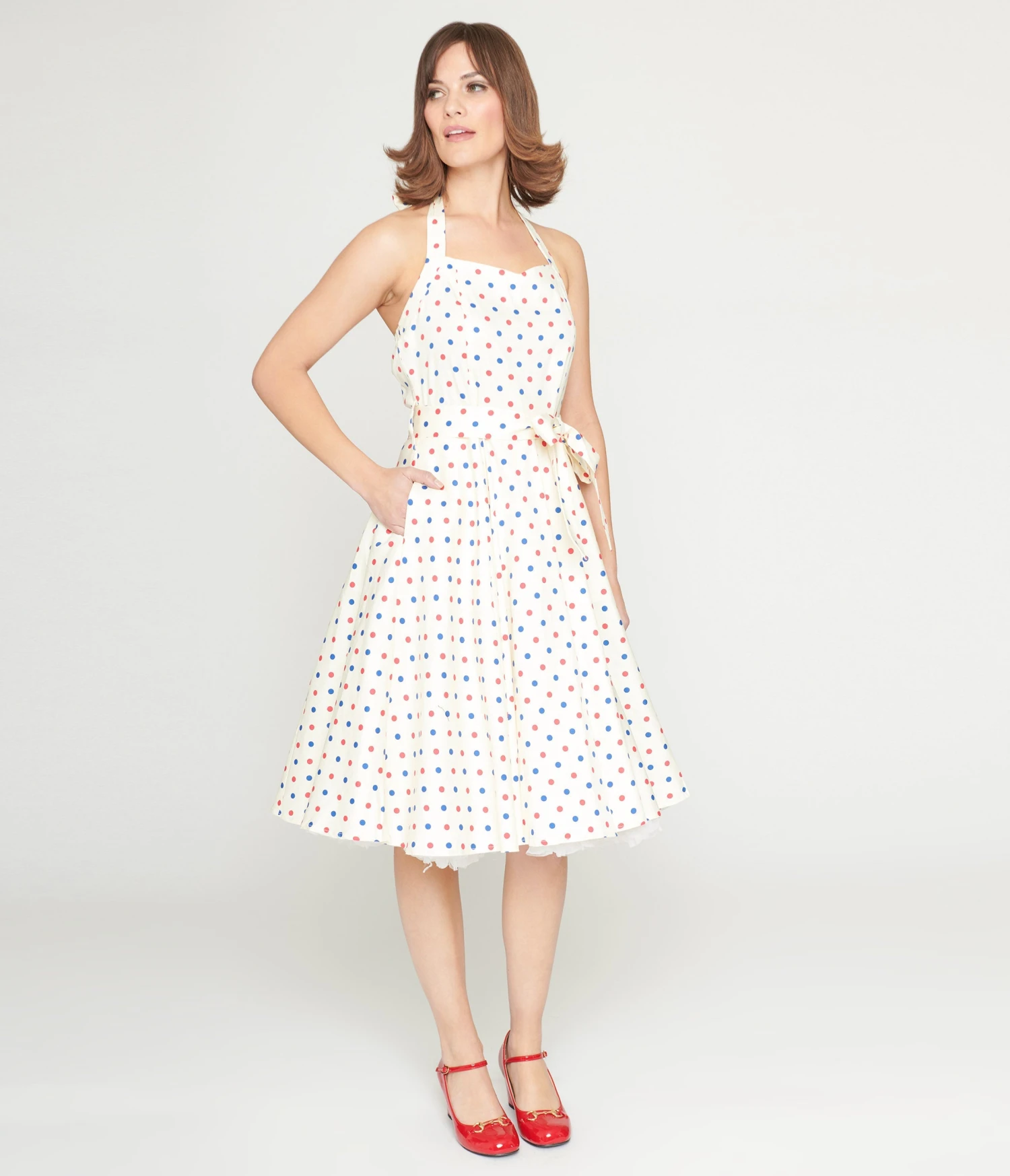 This charming swing dress is crafted in an ivory cotton blend and boasts blue and red polka dots throughout. Complete with self tie halter neck, side pockets, and size zipper.
