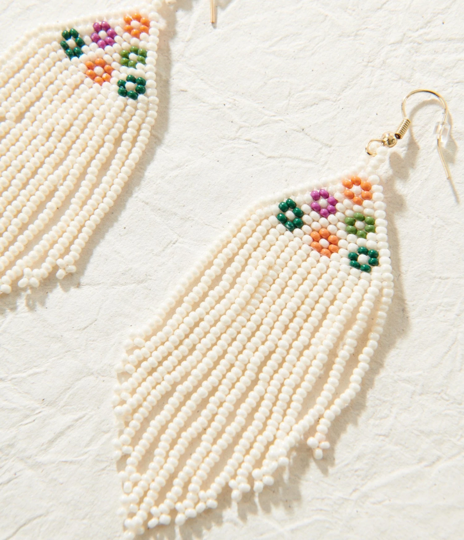 Ivory Floral Seed Triangular Beaded Fringe Drop Earrings