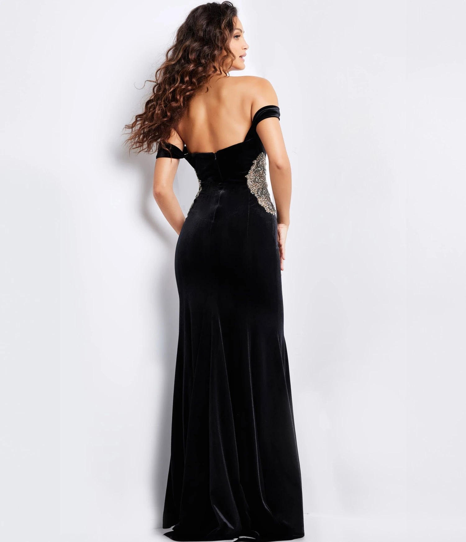 Jovani Black Velvet & Silver Beaded Applique Evening Gown