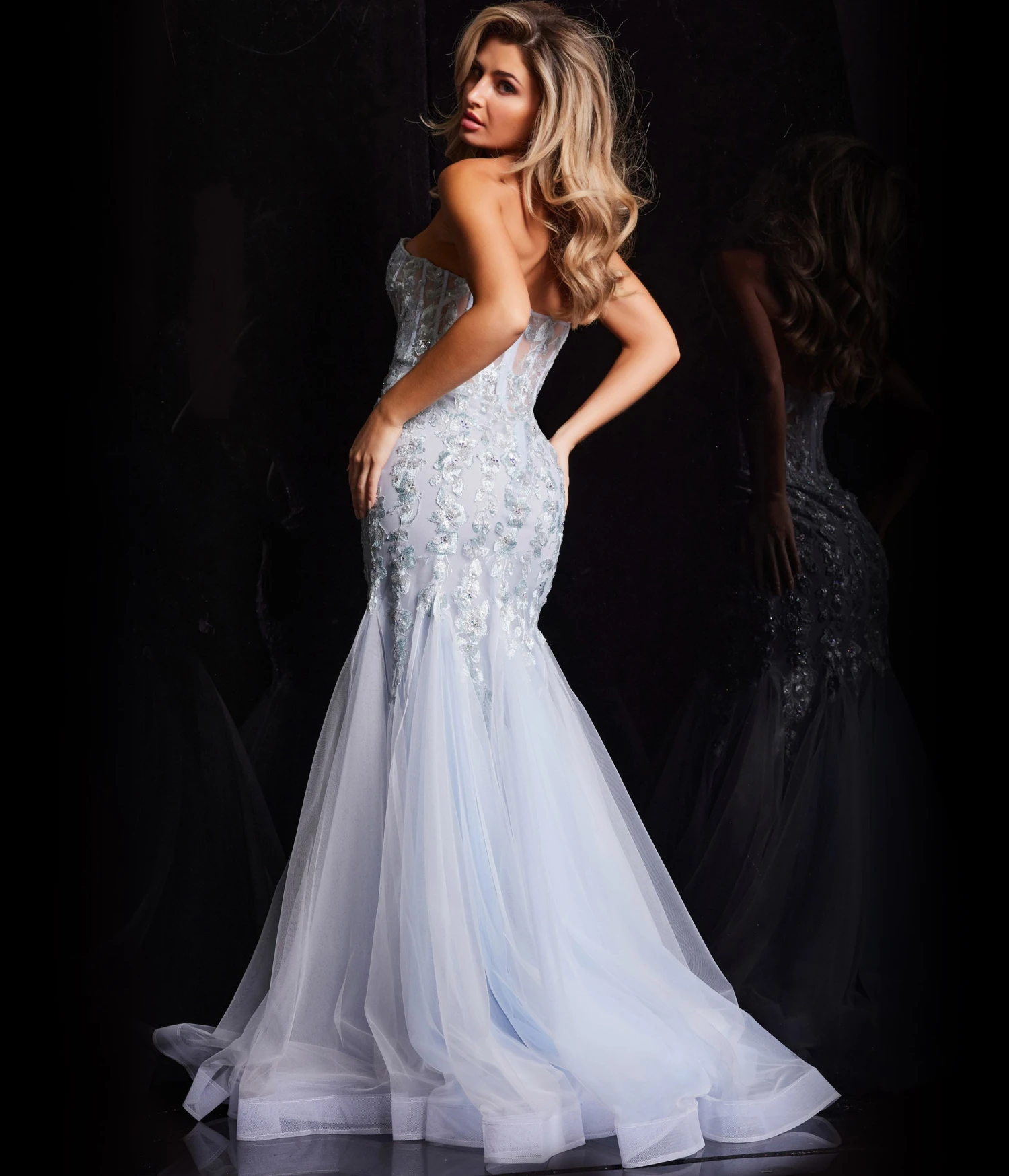 This show-stopping light blue formal mermaid gown effortlessly combines classic elegance with modern detailing. Crafted from delicate tulle, this floor-length dress is adorned with exquisite floral embroidery embellished with stones, creating a dazzling and luxurious effect. The mermaid silhouette features a flare bottom with a train and horsehair trim, adding drama and glamour to the overall design. The sheer corset bodice with boning provides structure and support, creating a flattering and fitted silhouette. The back style is straight, offering a clean and modern look. The strapless sweetheart neckline enhances the gown’s romantic appeal, framing the décolletage beautifully. The sleeveless design contributes to the sleek and sophisticated aesthetic.