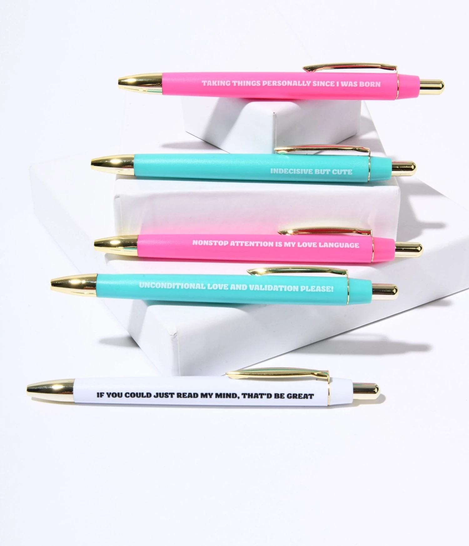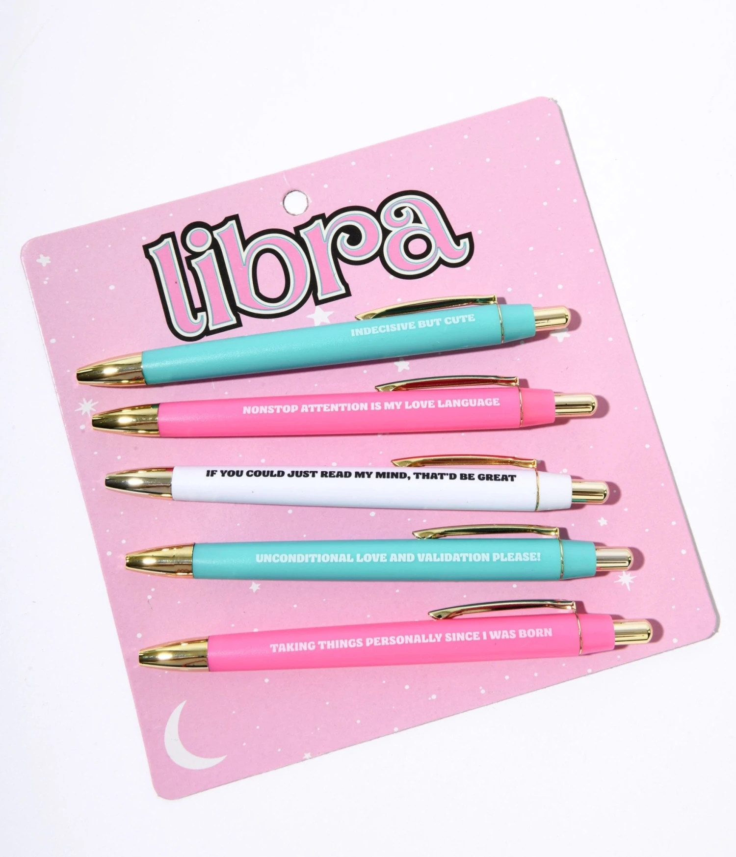 Get ready to add a touch of cosmic charm to your stationery collection with this Libra Pen Set. This set includes five sleek black ink ballpoint pens in blue, pink, and white, each featuring a unique text inspired by your favorite zodiac sign.
