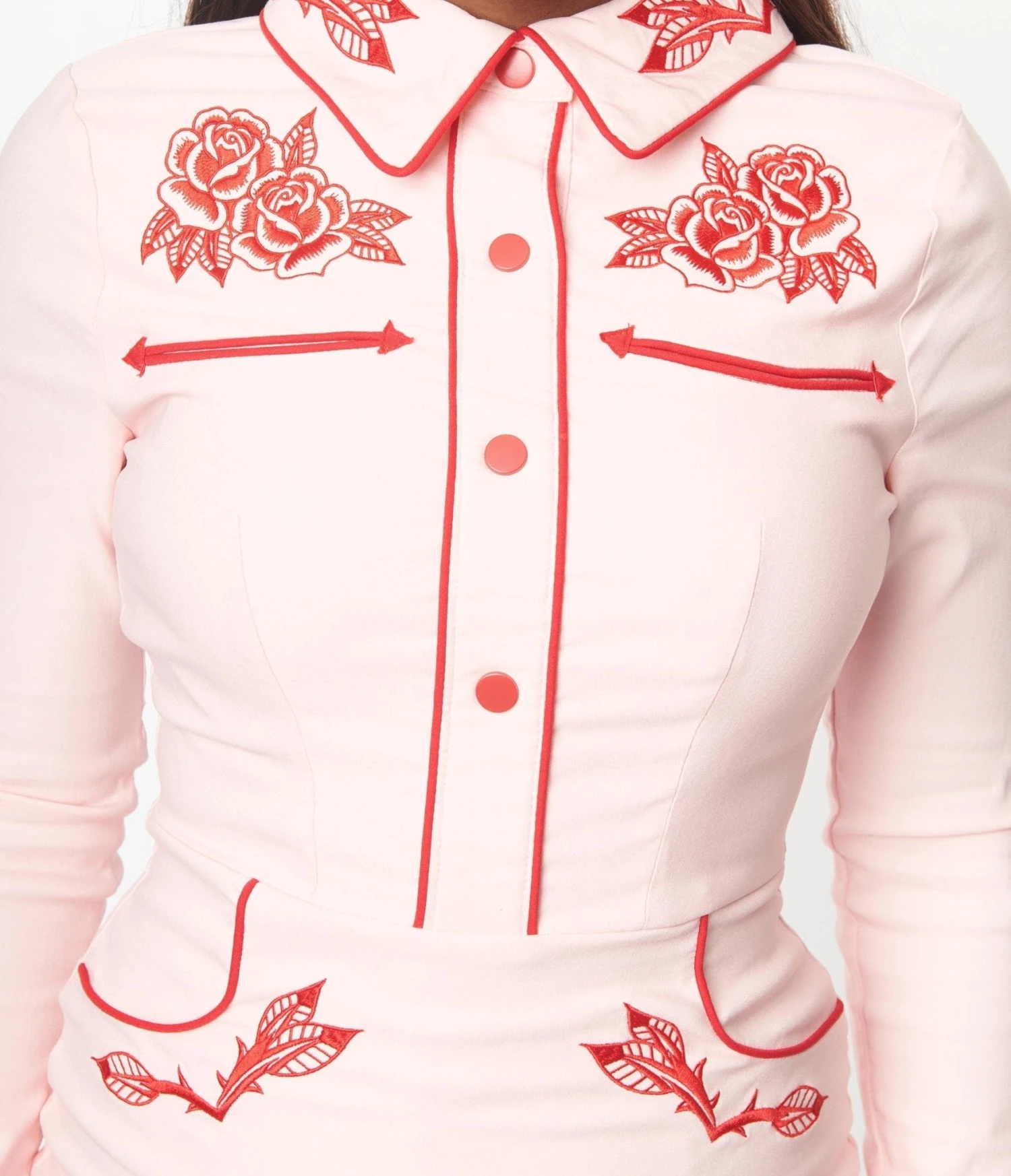 Grab a date to the rodeo! Crafted in a lovely light pink woven stretch blend boasting red roses, thorns, and piping throughout. Complete with a faux partial button up leading up to the decorated collar.