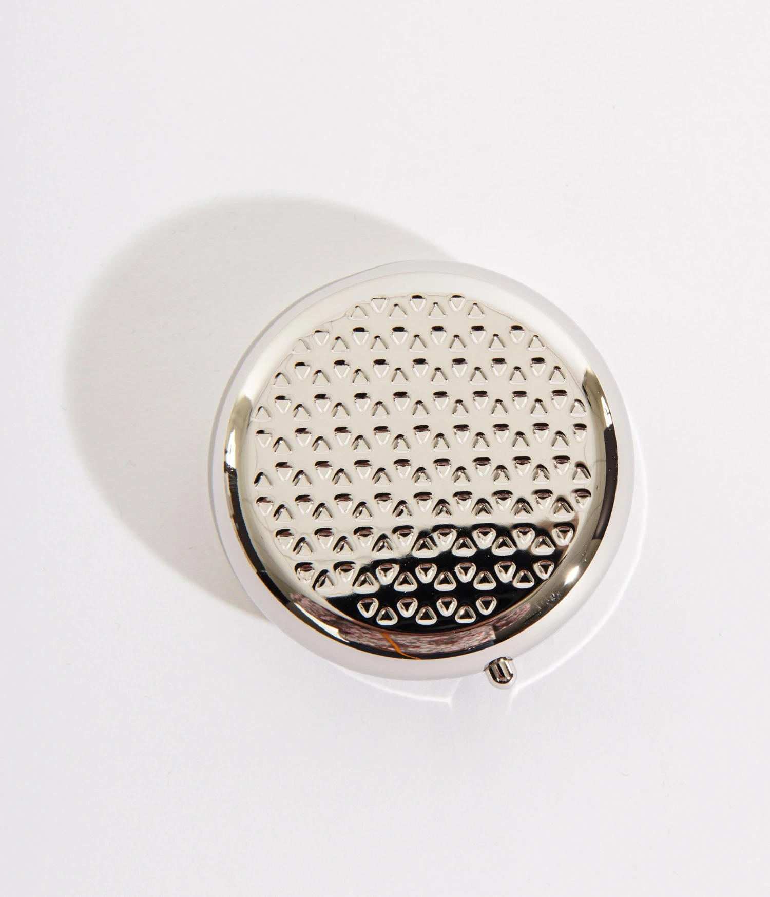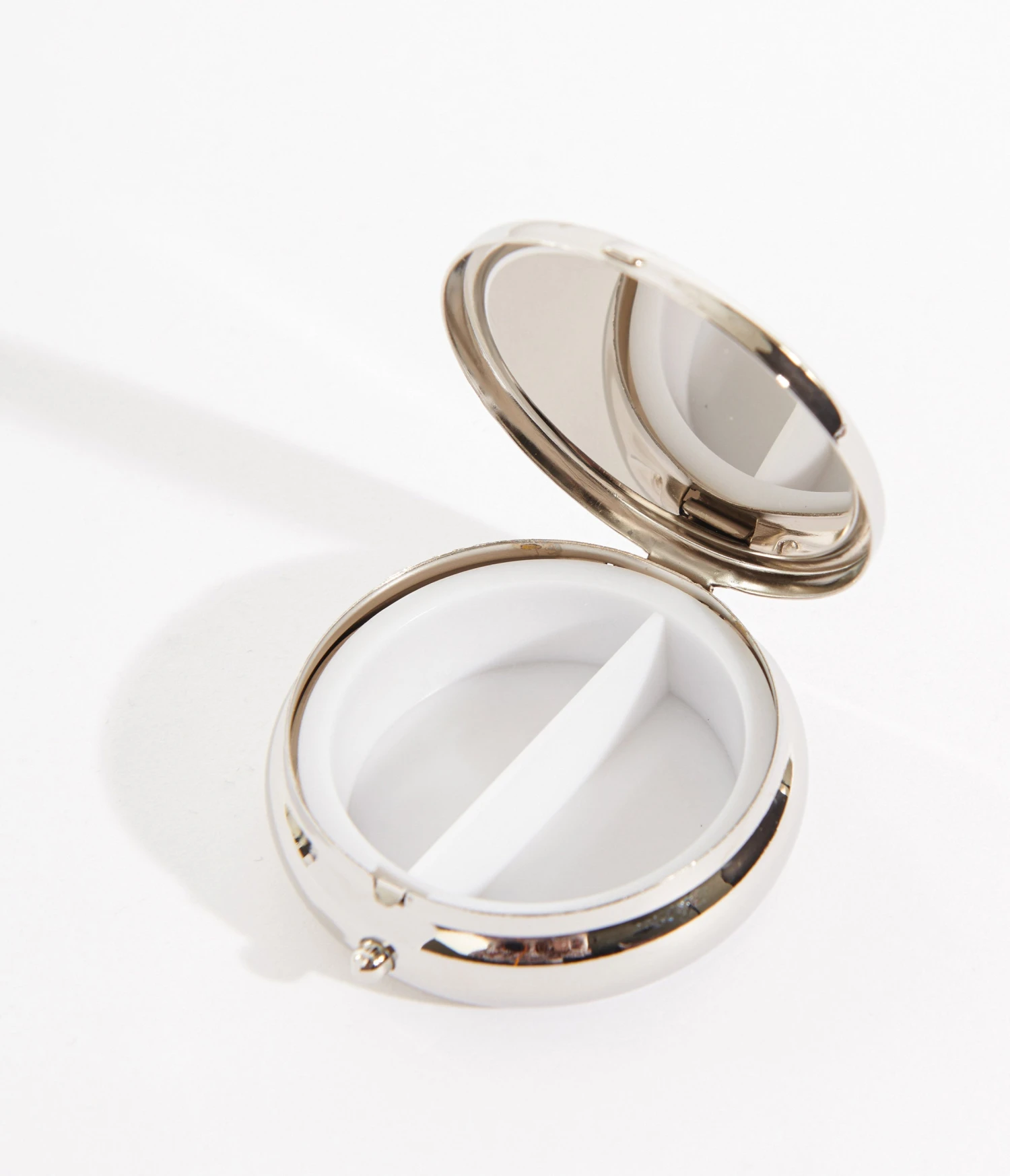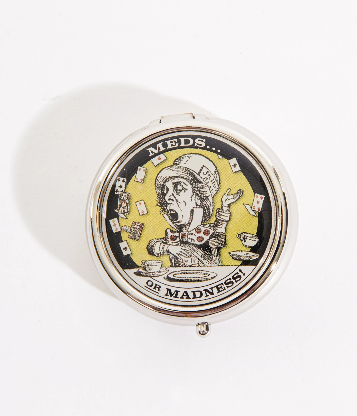 This little beauty features a whimsical design inspired by the iconic mad hatter and his eccentric world. With bold black letters spelling out “Meds Or Madness,” this compact pill box is not just functional but also adds a touch of fun to your daily routine. Flip open the lid and you’ll find a handy compact mirror perfect for those on-the-go touch-ups.