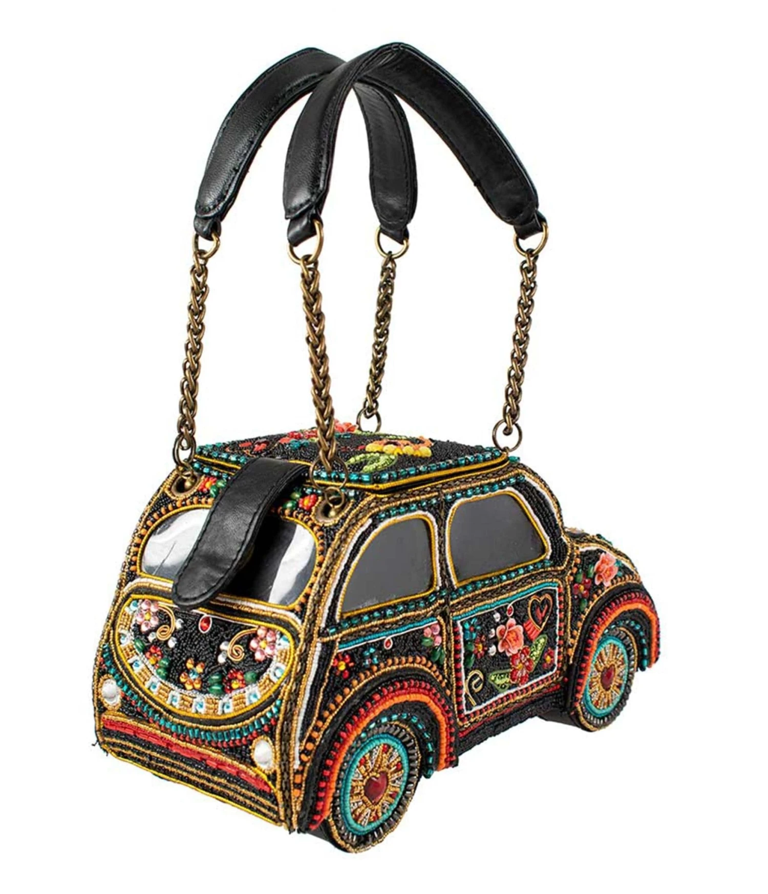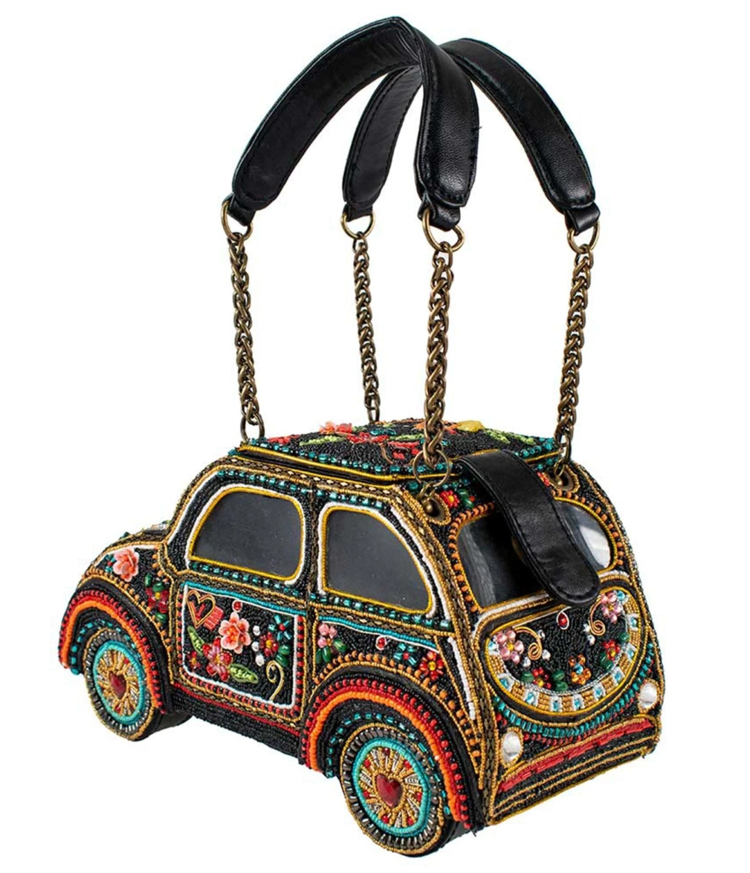 Beep beep! Drive away with the Joyride handbag from Mary Frances. A vibrant masterpiece of hand-laid beads that is as beautiful to display as it is to wear. The bag features beaded flowers and heart designs throughout. Outfitted with an inner pocket, magnetic flap closure, and dual vegan leather handles.