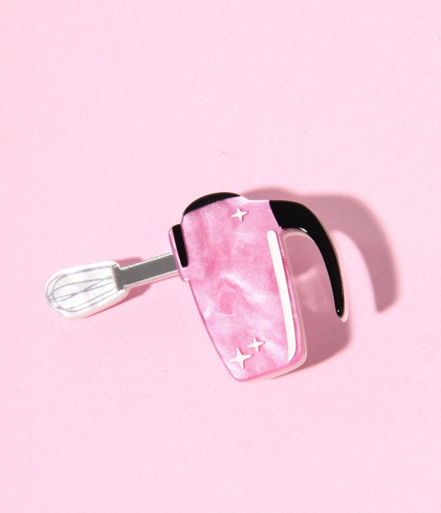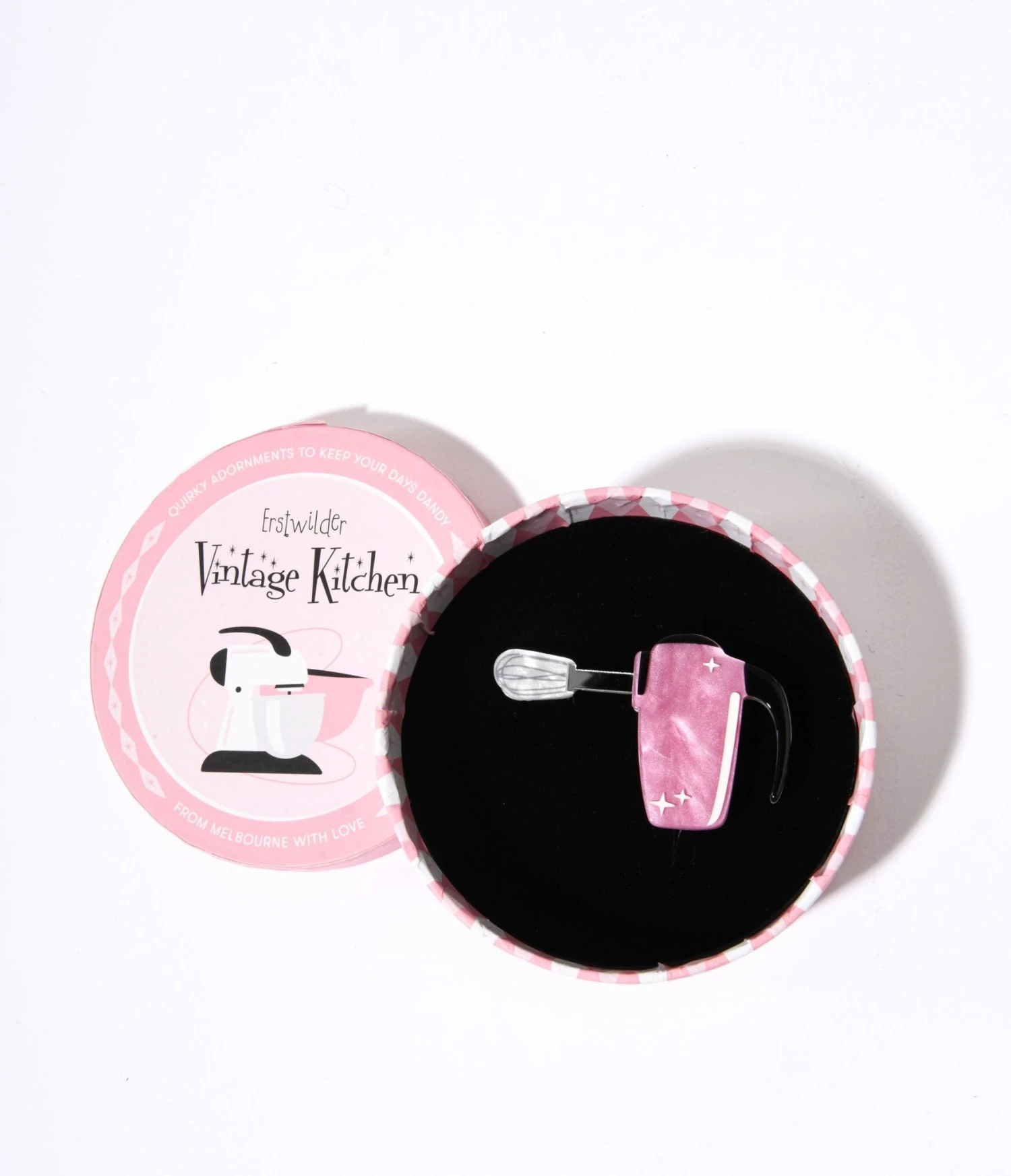 Get ready to add a dash of vintage charm with this lovely brooch! This adorable little piece is inspired by the retro pink electric hand mixers that once graced all kitchens. Handcrafted with love, this brooch is meticulously assembled using high-quality resin and beautifully finished with a delightful combination of printing, epoxy, and etching techniques. The attention to detail will leave you in awe! Complete with a safety pin back.