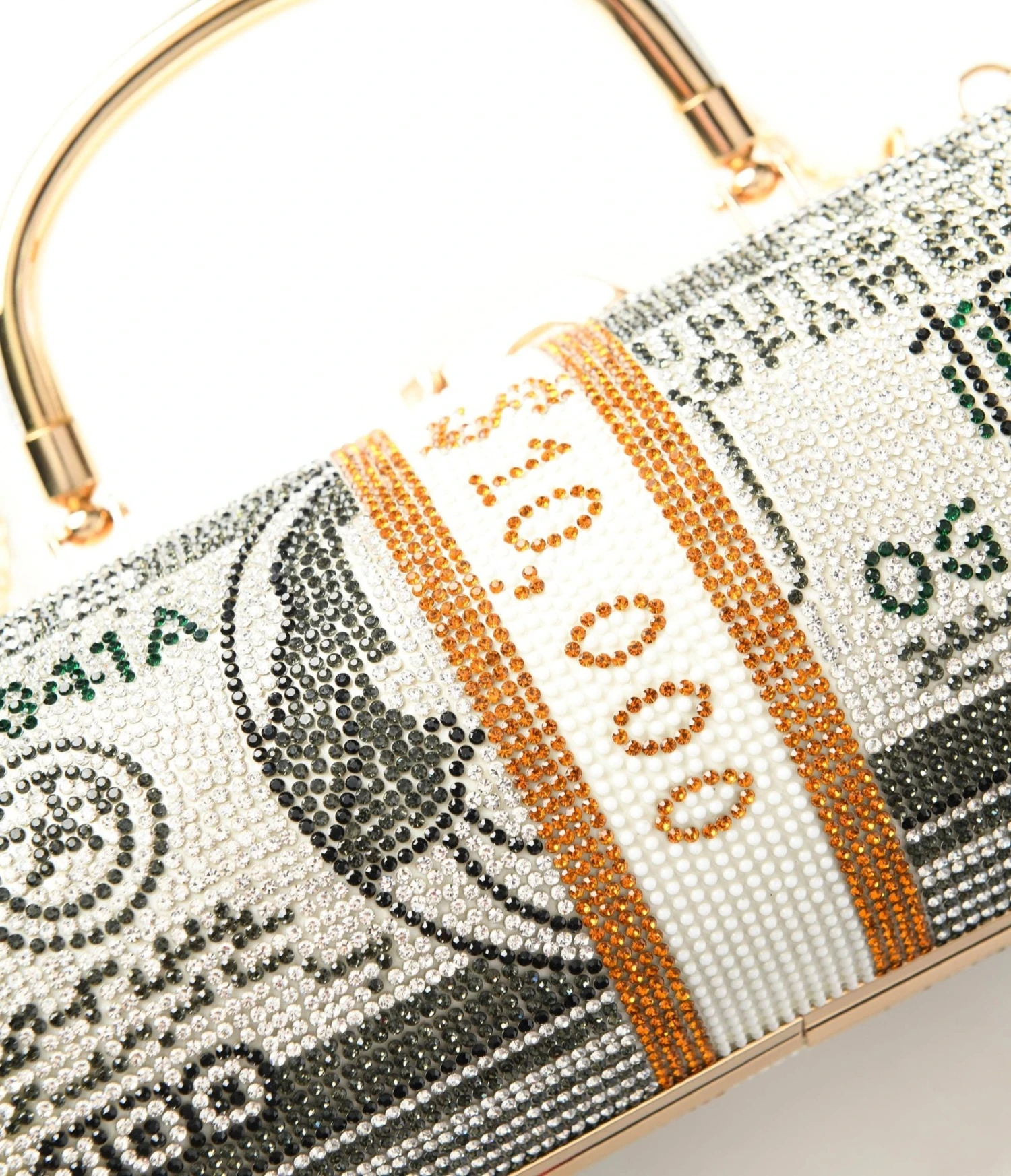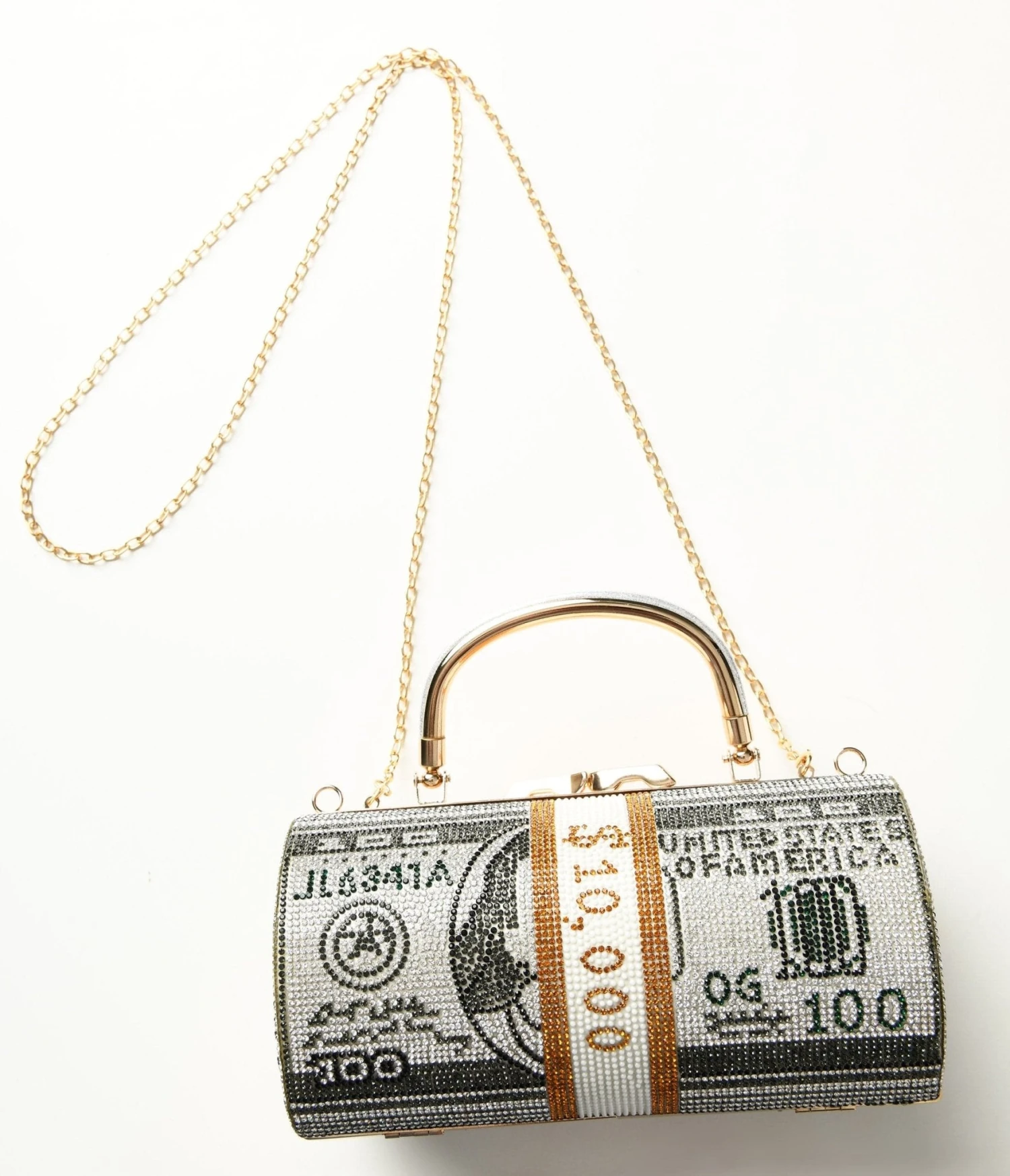 This showstopper is more than just an accessory – it’s a conversation starter. Designed to mimic the iconic $10,000 bill, its cylinder shape and rhinestone embellishments exude sheer opulence that will catch everyone’s eye. Opening this treasure reveals a secure kisslock closure ensuring your valuables are safe at all times. Plus, with its removable gold chain and gold top handle, you can rock this beauty either as a crossbody or carry it like a boss!