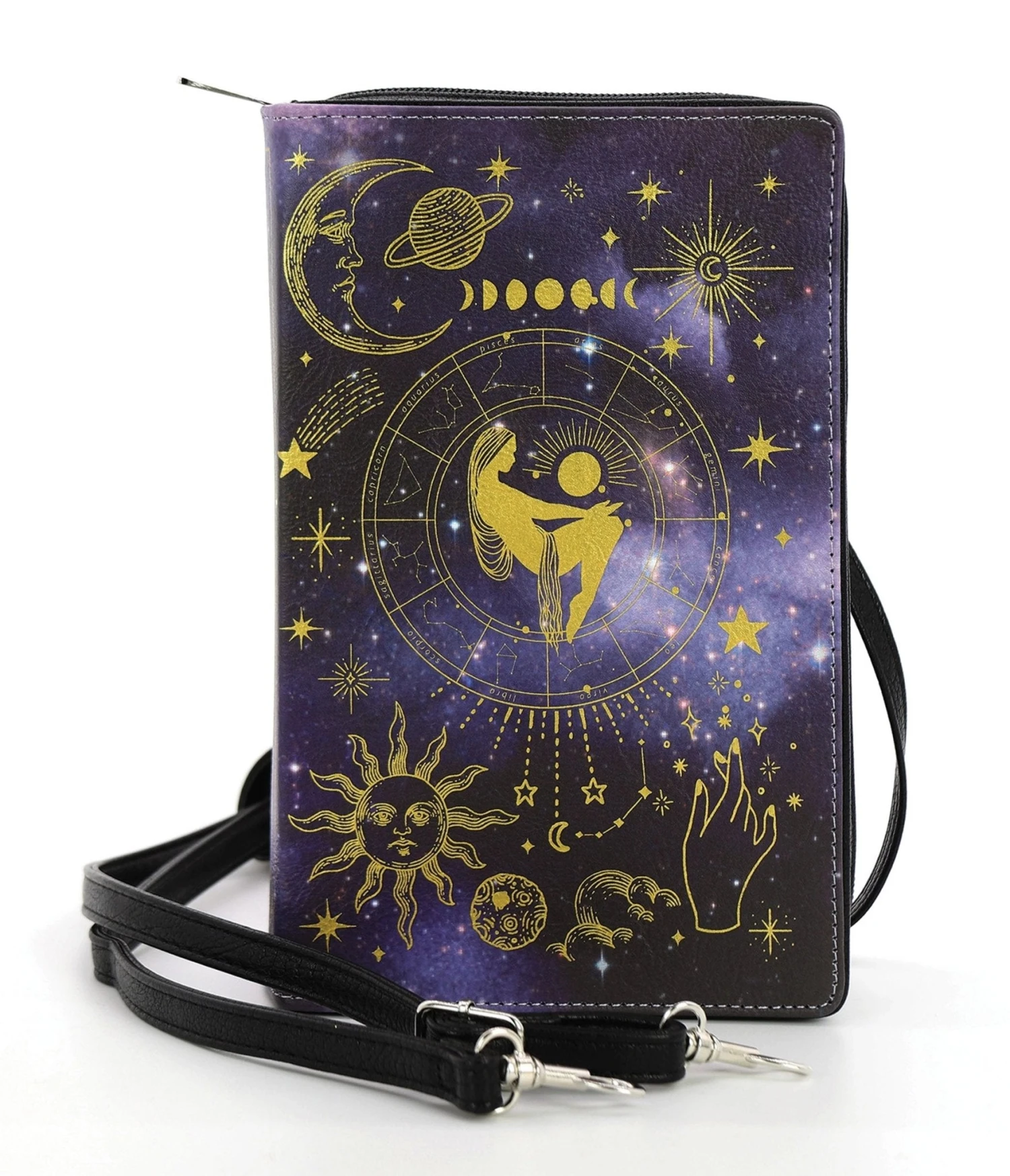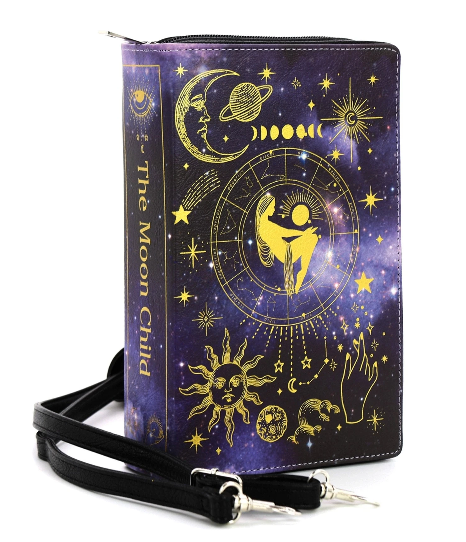 This dazzling clutch is crafted black leatherette set in the shape of a book with stunning Moon Child graphics. Complete with zip closure and removable shoulder strap.