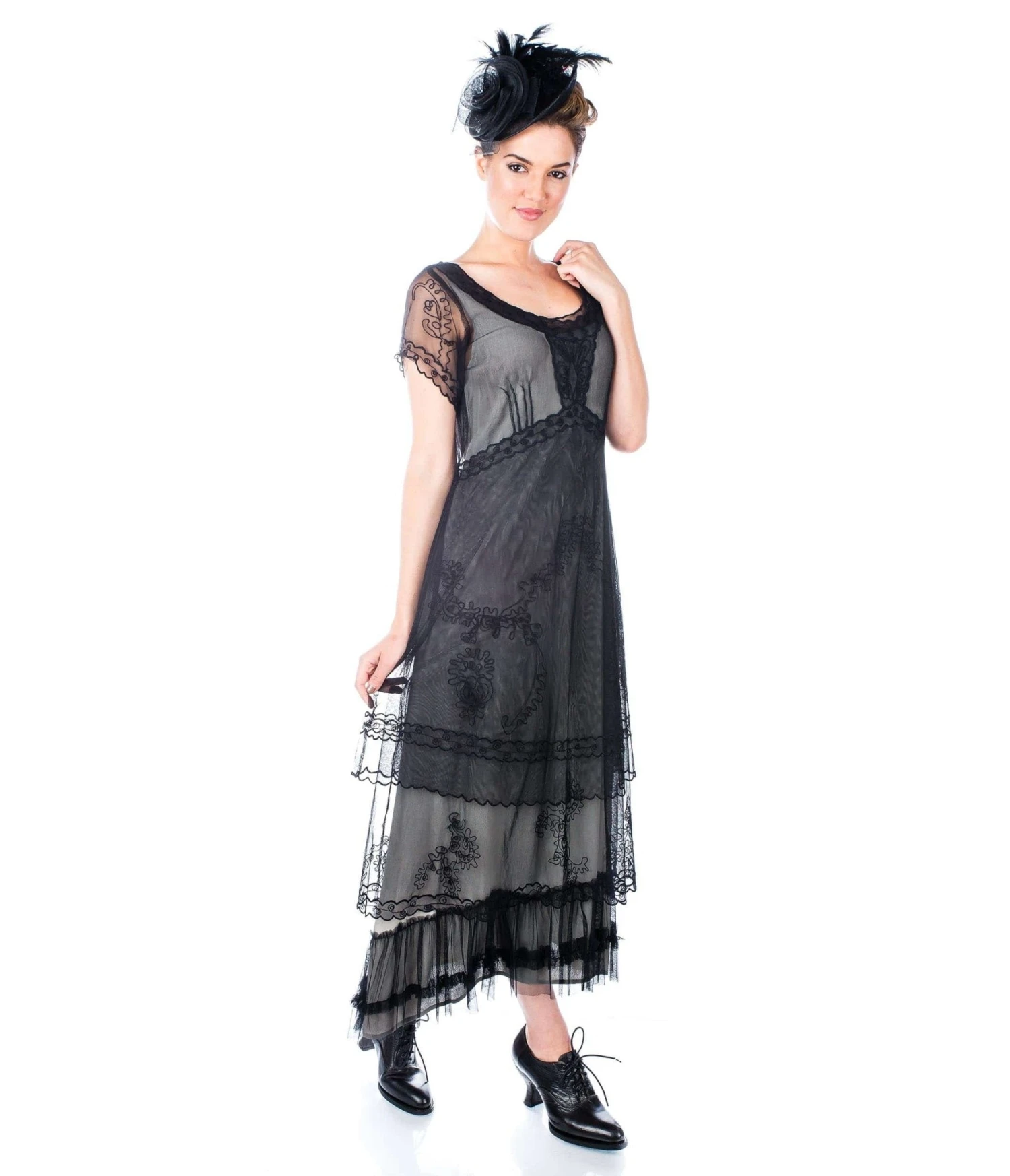 This lovely 1920’s style black dress by Nataya, features embroidered flowers swirling around the shoulder on a transparent cap sleeve and scalloped lace peeking from under the tulle shell. The embroidered yoke connects the embroidered insert at the waist to the neck and boasts a gorgeous A-line layered skirt that is embroidered with delicate bouquets. Send the message of true romance to the universe!